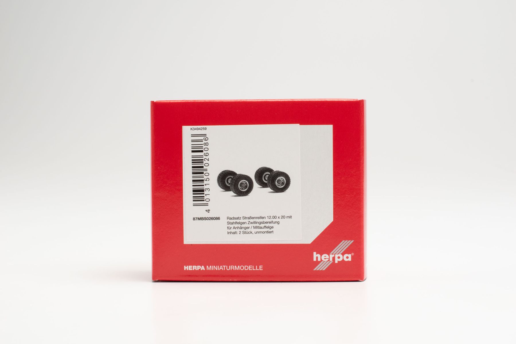 Produktinformationen "Herpa 87MBS026086 - Radsatz Straßenreifen 12.00 x 20 mit Stahlfelge Zwillingsbereifung für Anhänger / Mitlauffelge (Inhalt:2 Achsen)"