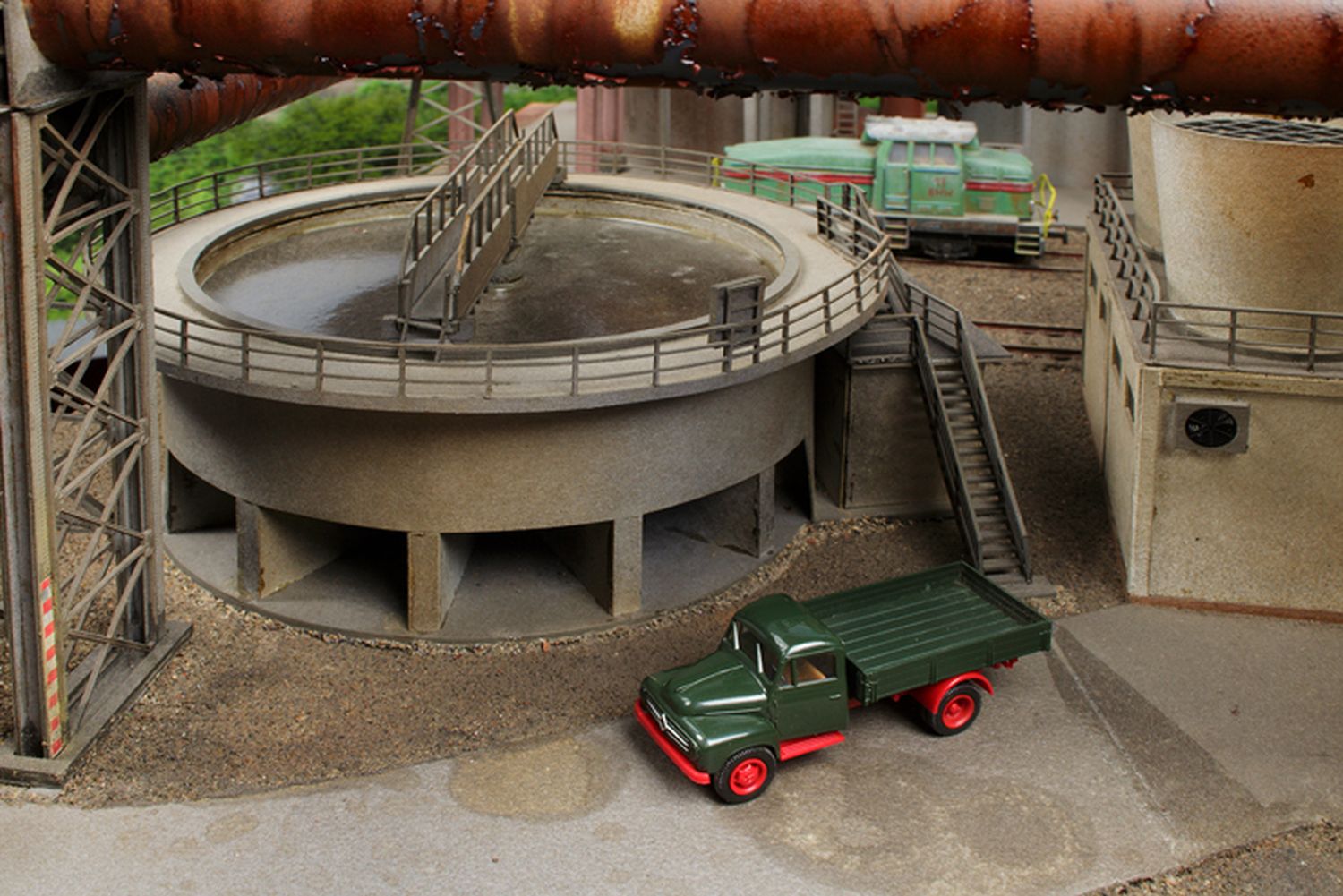 Bausatz H0 (1:87), Maße in mm: Durchmesser 153, Höhe 78. Nebengebäude mit Treppe Länge 100, Breite 42. Kläranlage zur Trennung von Flüßigkeiten und Schwebestoffen. Wird nicht nur in Klärwerken, sondern auch in vielen industriellen Bereichen wie z. B. Hochöfen und Zechen benötigt.
