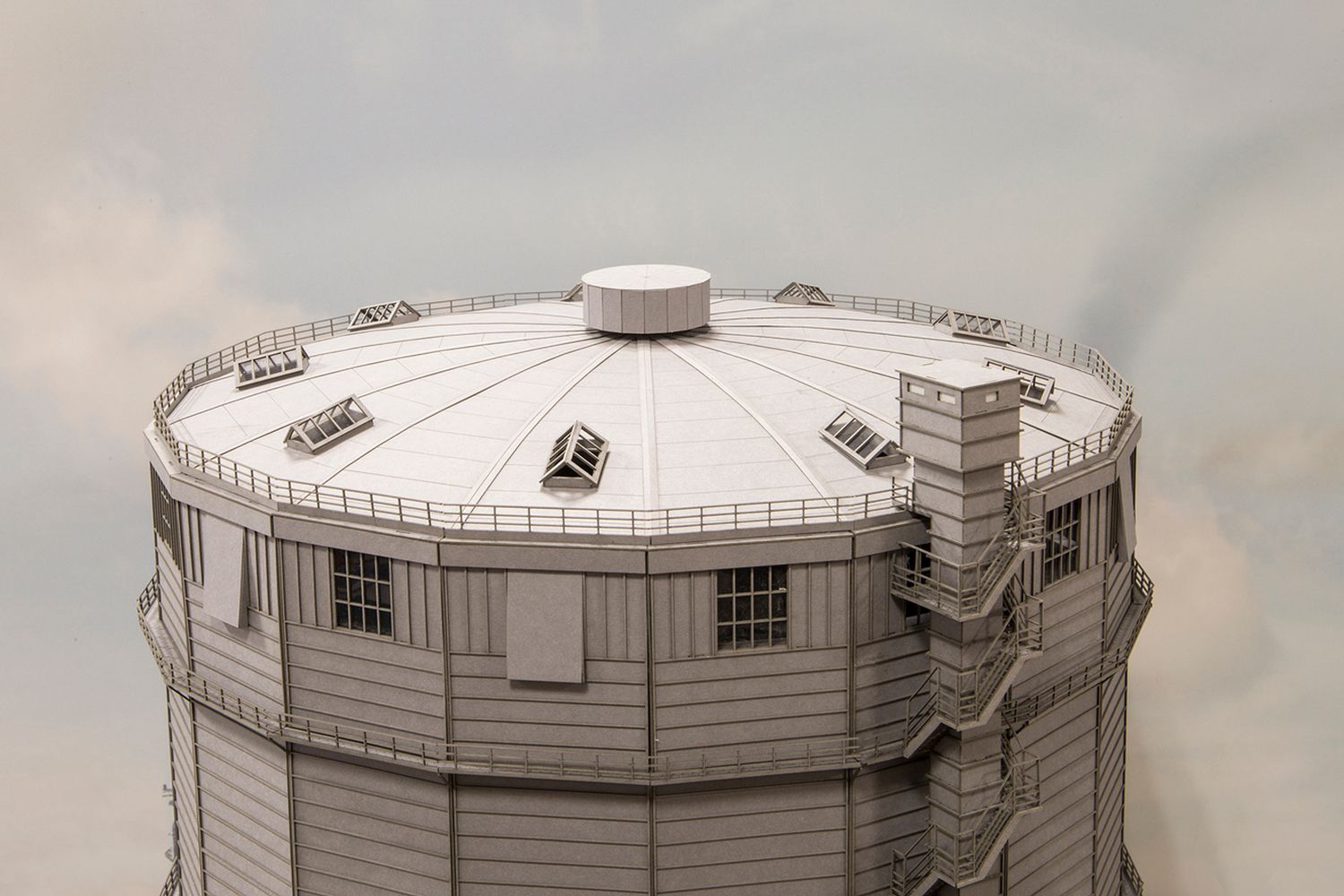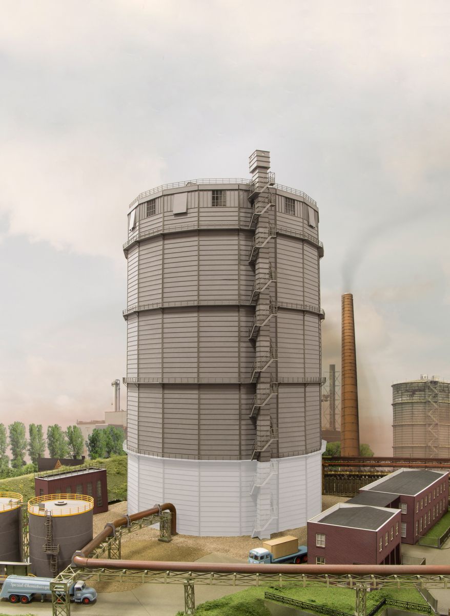 Gasometer nach Vorbildfotos der Kokerei Hansa, Bauart MAN. Ein sogenannter Scheiben-Gasbehälter, der Gasdruck wurde durch eine bewegliche Abdichtscheibe, die auf dem Gas lag, erhalten. Die Abdichtschürze wurde mit Spannfedern und Gewichten an die Außenwand des Behälters gedrückt. Zur Abdichtung war die Abdeckschürze etwa einen Meter hoch mit einer ölhaltigen Abdichtflüssigkeit bedeckt. Zur Luftzirkulation und zum Druckausgleich befanden sich Lüftungsöffnungen am oberen Rand der Dachhaube. Unser Bausatz ist auch als Halbrelief erhältlich Art. 17053. Bausatz H0 (1:87), Maße in mm: Ø 450 (+Aufzug) x H 600. Grundbausatz besteht aus 3 Ringen und Dachring.