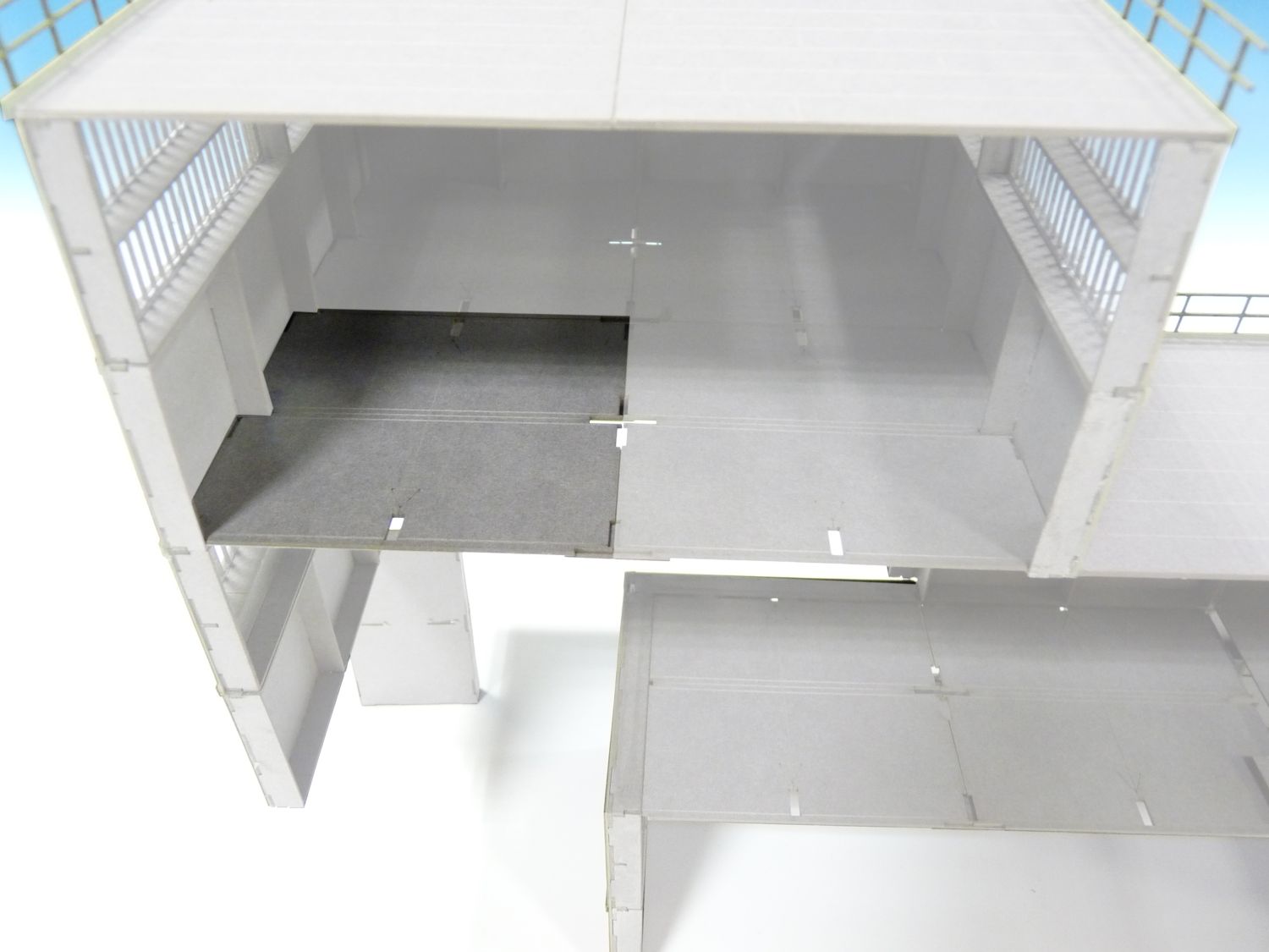 Das Bauhaus-Baukastensystem 14 verschiedene Elemente die variabel miteinander kombiniert werden können. Ein Rastermaß: 37,5 mm lang/breit und 37,5 mm hoch, beziehungsweise ein mehrfaches davon. Zahlreiche weitere Bausätze aus unserem Programm sind auf dieses Raster abgestimmt, wie zum Beispiel das Bandbrückensystem, die Treppe mit Absatz 40056, die Rohrbrücken 40009,40010,40011 und die große Rohrbrücke 17129. Die Fassadenelemente eignen sich für Hintergrundgebäude im Relief oder auch als Vollgebäude. Es gibt ein Set mit Zwischendecken und eines mit Dachplatten. Zwei weitere Sets beinhalten Stützen um Gebäudeteile mit dem Zug zu unterfahren. Wir arbeiten derzeit an einer Planungshilfe, wegen der doch umfangreichen Möglichkeiten