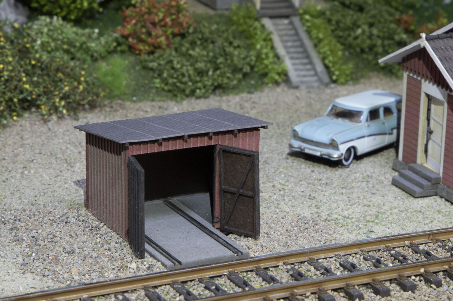 Kleiner Schuppen für eine Fahraddraisine . Passend zu unserem Bahnwärterhäuschen (Art. 25015) aber auch als Geräteschuppen einsetzbar. Solche Schuppen standen bei vielen Bahnwärterhäuschen, mit den Draisinen wurde die Strecke inspiziert. Maße in mm 43 x 33 x 29.