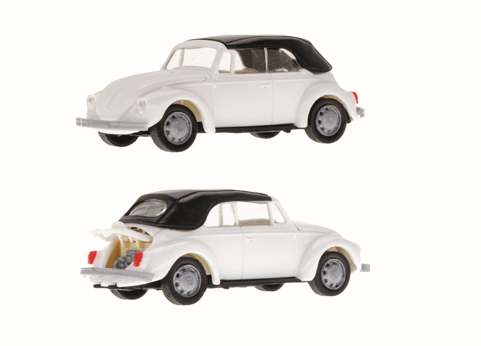 Bausatz. Der VW Käfer Typ 11 als Version 1302 wurde von 1970 bis 1972 gebaut und hatte mit der größten Motorisierung 50 PS aus einem Vierzylinder Boxermotor mit 1600 ccm. Bei diesem Modell kam erstmals eine modernere Vorderachse mit MacPherson-Federbeinen und eine moderne Schräglenkerhinterachse zum Einsatz. Während der Produktion dieses Modells löste Volkswagen im Jahr 1972 mit dem Käfer das Model T von Ford als meistgebautes Auto der Welt ab. Dieses besondere Modell kann in zwei verschiedenen Versionen zusammengebaut werden: Mit geschlossenem und mit offenem Verdeck. Der Kofferraumdeckel ist zum Öffnen mit Blick auf den angedeuteten Motor. Als Weißmodell zum Selbstlackieren. L 4,8 x B 1,9 x H 1,6 cm Schwierigkeitsgrad: 2 (Fortgeschrittene)
