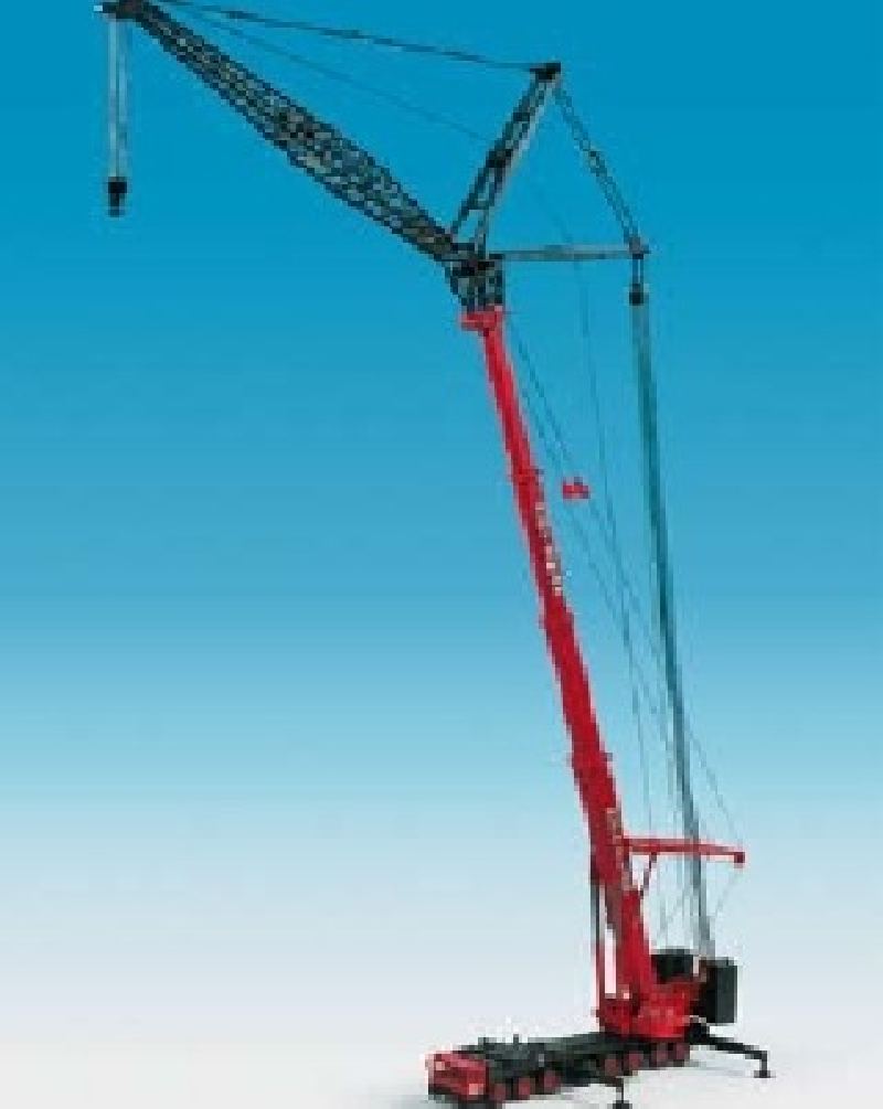 Bausatz. Vorbilddaten: Seit 1988 wird bei LIEBHERR dieser 8-achsige Teleskopkran LTM 1400 gefertigt, der zwischenzeitlich zu dem erfolgreichsten Gerät der 400-Tonnen-Klasse zählte. Er bietet Mobilität und Vielseitigkeit. Trotz 96 t Gesamtgewicht inklusive 50 m Teleskopausleger ist der nur 17,5 m lange Autokran kompakt und wendig. Der Fahrantrieb erfolgt durch einen DAIMLER-BENZ Turbomotor mit 390 kW/530 PS. Am Teleskopausleger ist eine Teleskop-Abspannausrüstung angebracht. Diese dient der Traglaststeigerung um bis zu 50%. Beim Transport des Autokranes auf der Straße verbleibt diese Abspannung auf dem Ausleger abgelegt am Fahrzeug. Ein 2. Hubwerk wird am Heck des Kranoberwagens angebolzt. An diesem wird auch das Gegengewicht von bis zu 125 t aufgelegt. Am Hauptausleger wird eine Hubhöhe von 46,9 m erreicht. Mit der wippbaren Gitterspitze beträgt die Hubhöhe sogar max. 132 m, wobei eine Ausladung von 96 m möglich ist. Auf der Baustelle kann der Kran voll aufgerüstet mit Ballast bis zu einem Gesamtgewicht von 272 t verfahren werden.