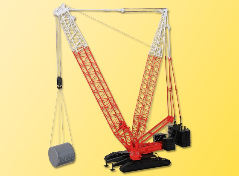 Bausatz. Vorbilddaten: MERCEDES-BENZ 10 Zylinder Dieselmotor, Typ OM 423 A, 300 kW/408 PS, Hublast max. 800 t, Raupenfahrwerk mit je 2 auf jeder Seite befindlichen Einzelantrieben, schwerer Hauptausleger 35 – 77 m, Schwebeballast max. 250 t. Aufgrund seiner extremen Größe sind mehrere LKW nötig, um das Vorbild dieses Raupenkrans zu transportieren. Dazu wird er in seine Einzelteile zerlegt, so dass das Raupenfahrwerk, die Gittermasten und die Ballastgewichte einzeln transportiert werden können.