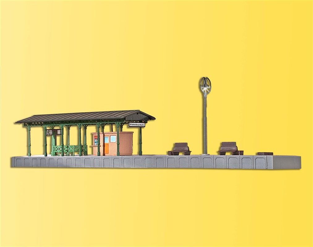 Funktionsbausatz. Der Bahnsteig ist ausgestattet mit 2 vormontierten LEDs warmweiß und einer nostalgischen Viessmann Bahnsteigleuchte Art.-Nr. 6435.