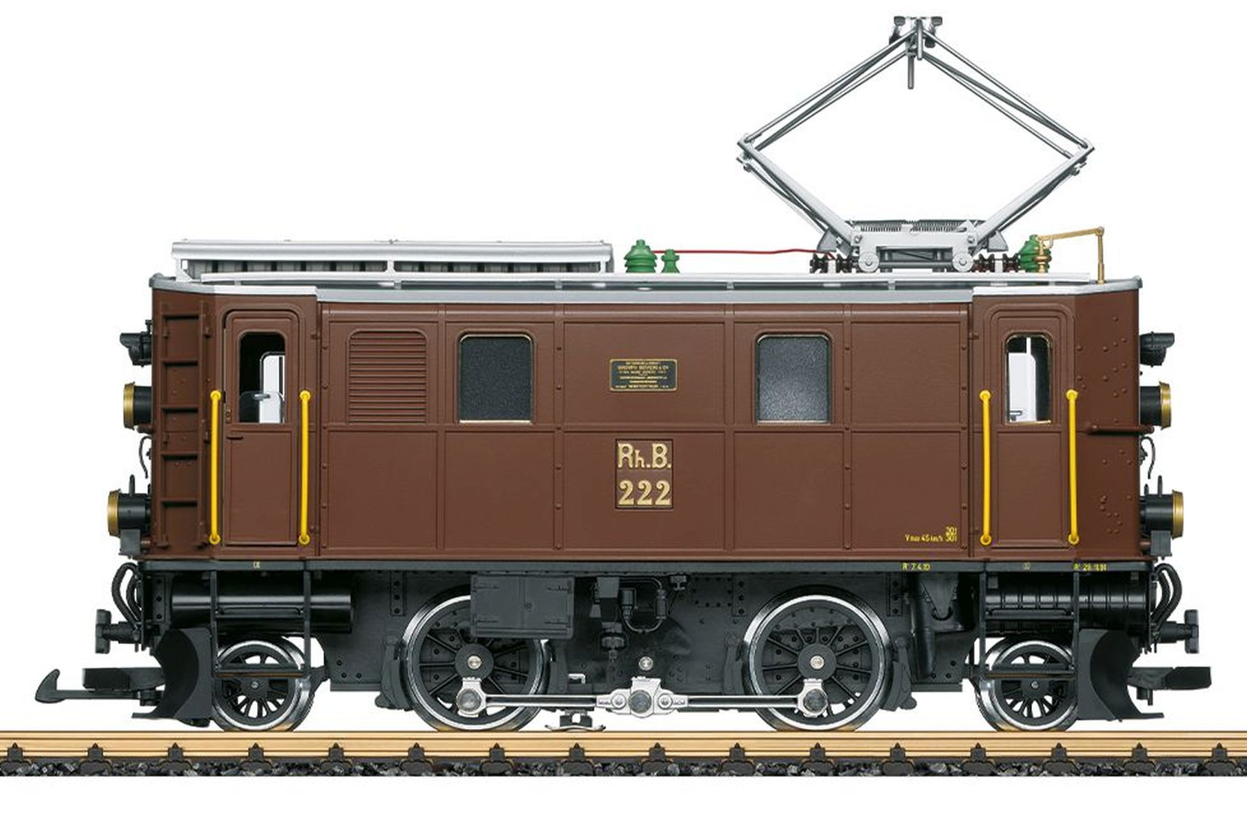 Modell der Elektrolok Ge 2/4 mit der Nummer 222 der RhB in der Version wie sie heute noch als historische Lok existiert.