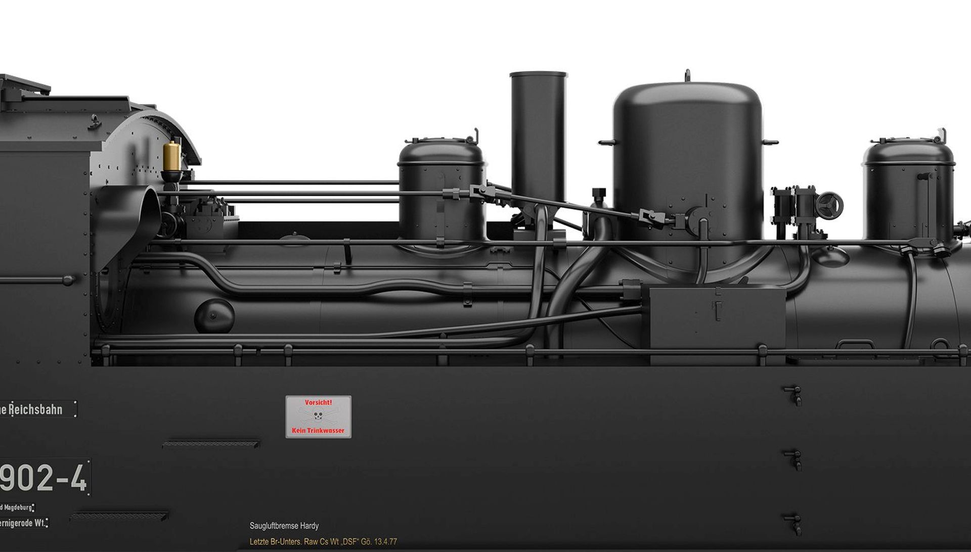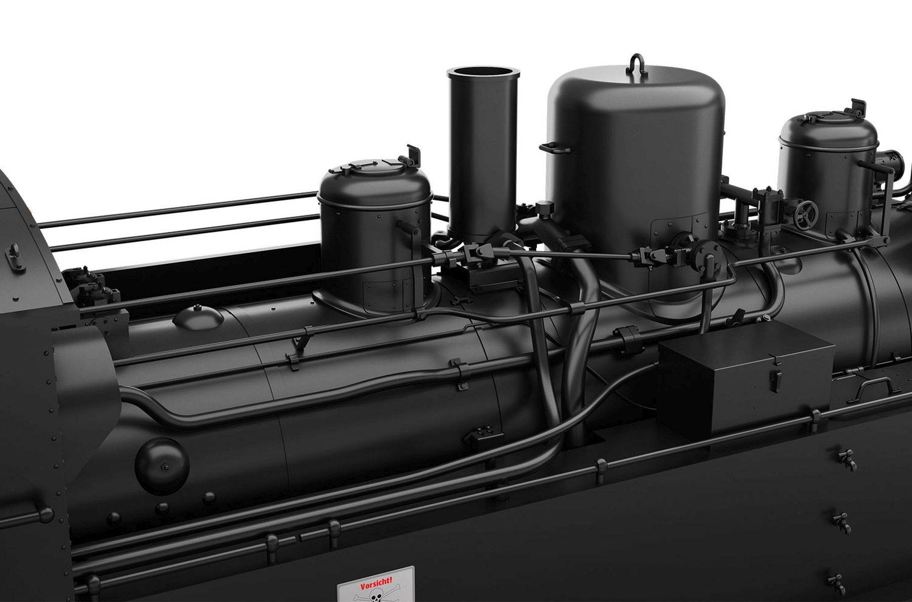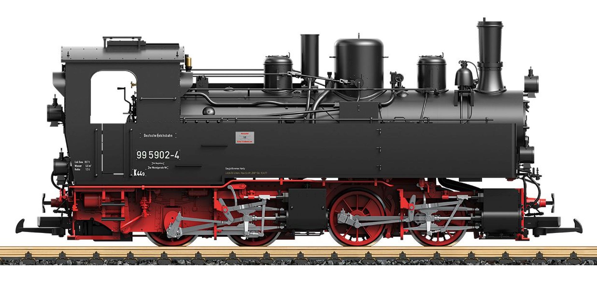 Modell der Dampflok 99 5902 der Deutschen Reichsbahn. Feindetailliertes Modell in schwerer Metallbauweise mit vielen angesetzten Details. Antrieb mit zwei Hochleistungsmotoren, alle Treibradsätze über Kuppelstangen angetrieben. Türen zum Führerstand und Rauchkammertür zum Öffnen. Feindetailliertes Fahrwerk der Bauart Mallet mit vielen Details wie komplettes Gestänge und Antrieb der Schmierpumpe. Originalgetreue schwarz/rote Farbgebung und Beschriftung der Epoche IV, so wie die Lok damals bei der DR im Einsatz war. Alle Unterschiede gegenüber der Version der Lok in der heutigen Version sind nachgebildet, so hat das Modell - so wie das Original - keine Luftpumpe, da es mit einer Vakuumpumpe ausgerüstet war. Auch die unterschiedliche Leitungsführung am Kessel ist originalgetreu nachgebildet. Ausgerüstet mit einem mfx/DCC-Decoder mit vielen Licht- und Soundfunktionen wie Spitzenlicht, Führerstandsbeleuchtung, Fahrgeräusch, durch Reedschalter auslösbare Pfeife und Glocke sowie vieles mehr. Fahrgeräusch auch im Analogbetrieb funktionsfähig. Eingebauter Rauchgenerator mit radsynchronem Dampfausstoß sowie Zylinderdampf und Dampfausstoß an der Pfeife, wenn diese betätigt wird. An beiden Enden digital schaltbare LGB-Systemkupplungen, diese können demontiert werden. Federpuffer. Länge über Puffer 40 cm.
