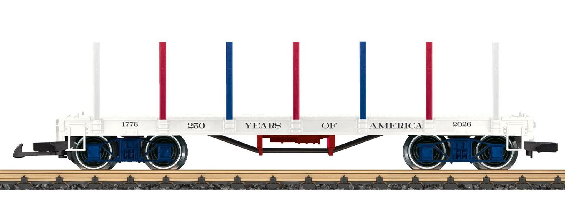 2026 wiederholt sich die Unterzeichnung der Unabhängigkeitserklärung in Amerika. Zu diesem Jubiläum bringt LGB ein Sonderwagen heraus. Flachwagen in den US-Farben gestaltet. Wagenboden aufwendig mit verschiedenen Bilder zum Thema Unabhänigkeit bedruckt. Passende Beladung der Liberty Bell. Beiligende Rungen in den US-Farben. Metallradsätze. Länge über Kupplung 42 cm.