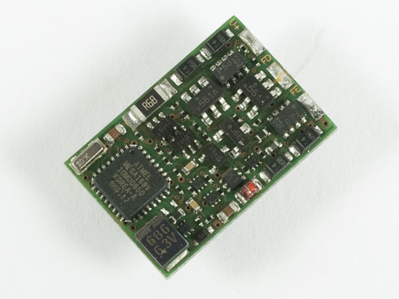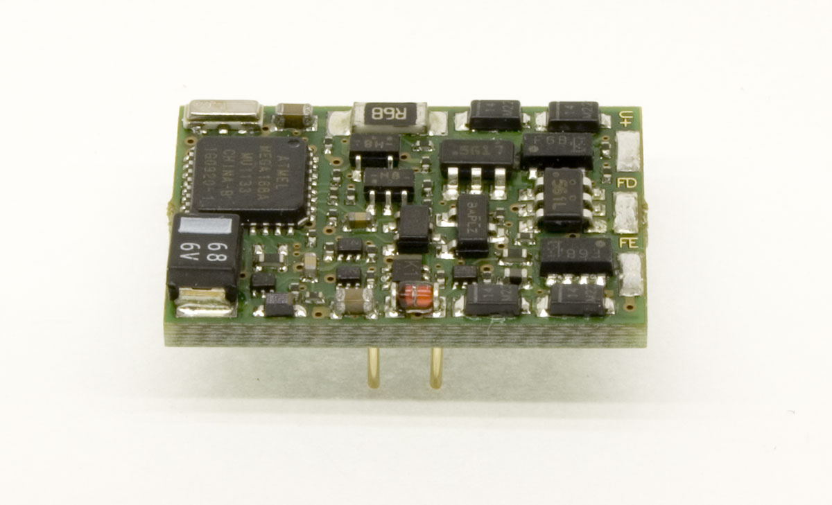 19x13x3,4mm, RailCom, ABC, hochfrequente Regelung, fünf F-Ausgänge je 500 mA belastbar, Gesamtbelastbarkeit aller F-Ausgänge: 500 mA, Funktionsausgänge zeitgesteuert schaltbar (z.B. für ferngesteuerte Kupplungen), Ausgänge kurzschlussgeschützt, 2- und 4-stelligen Adressen, Mehrfachtraktion, automatische Erkennung digitaler/analoger Betrieb, Rangiergang