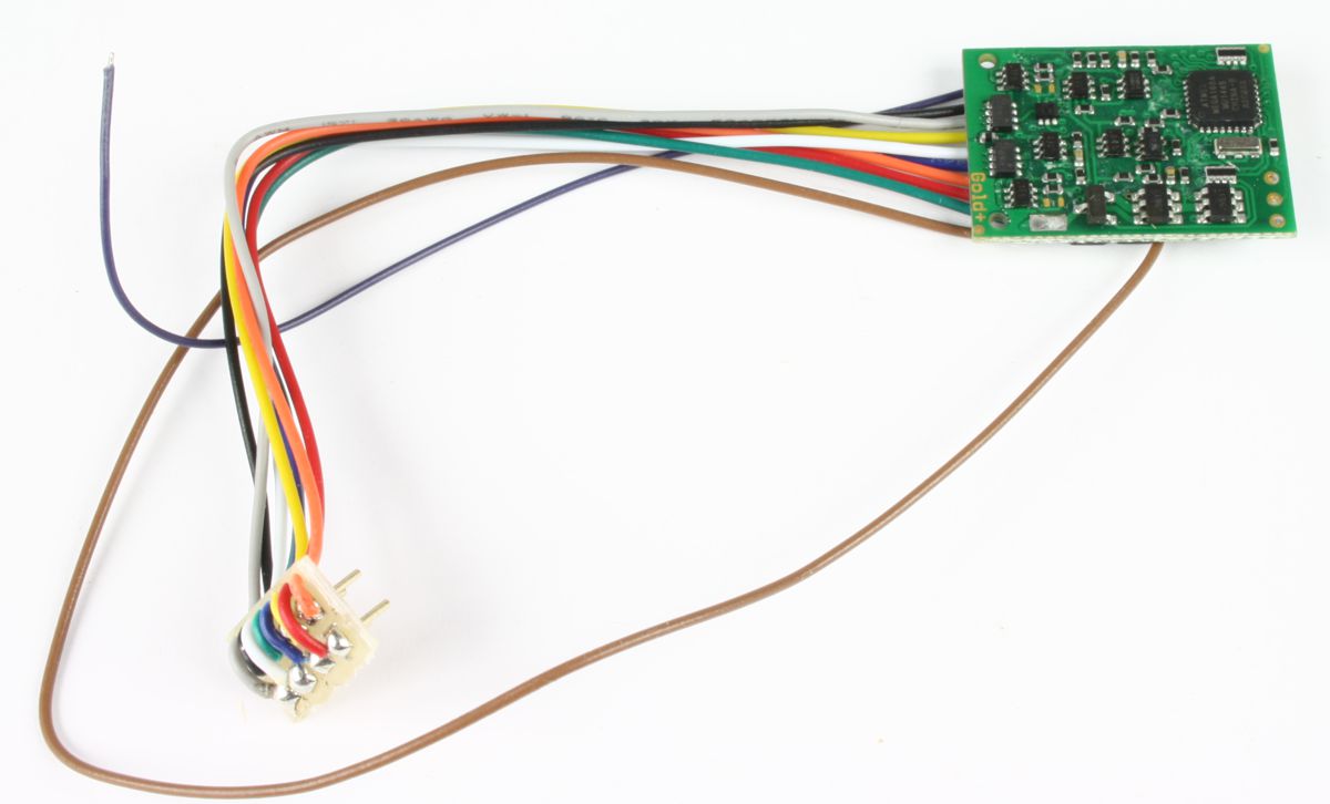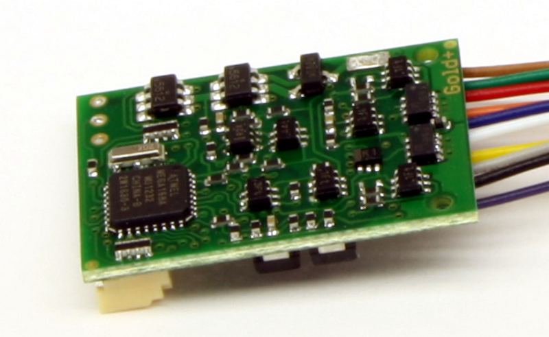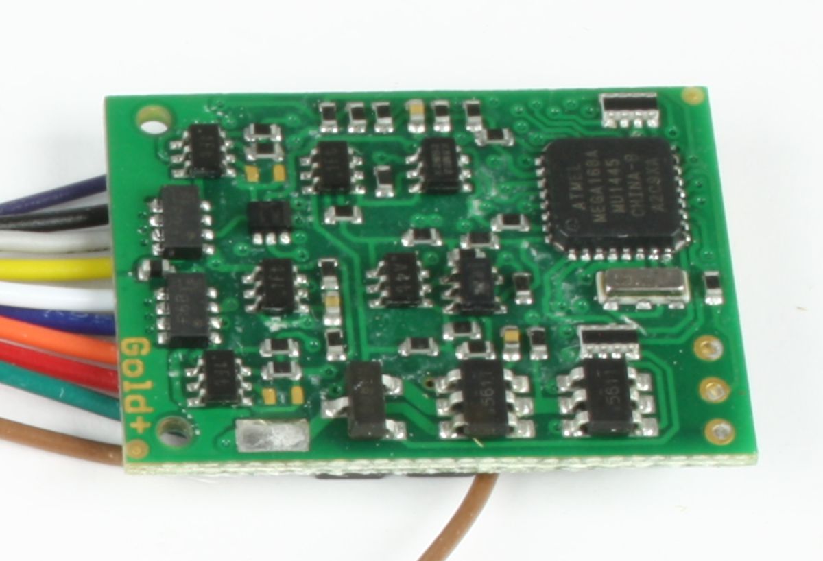 Lokdecoder "Gold+" Dauerbelastbarkeit 1000 mA, 4 Funktionsausgänge, mit Schnittstelle NEM652 (die Funktionsausgänge 3 und 4 sind als Kabel herausgeführt), ABC, USP, Railcom, S.U.S.I.-Schnittstelle,