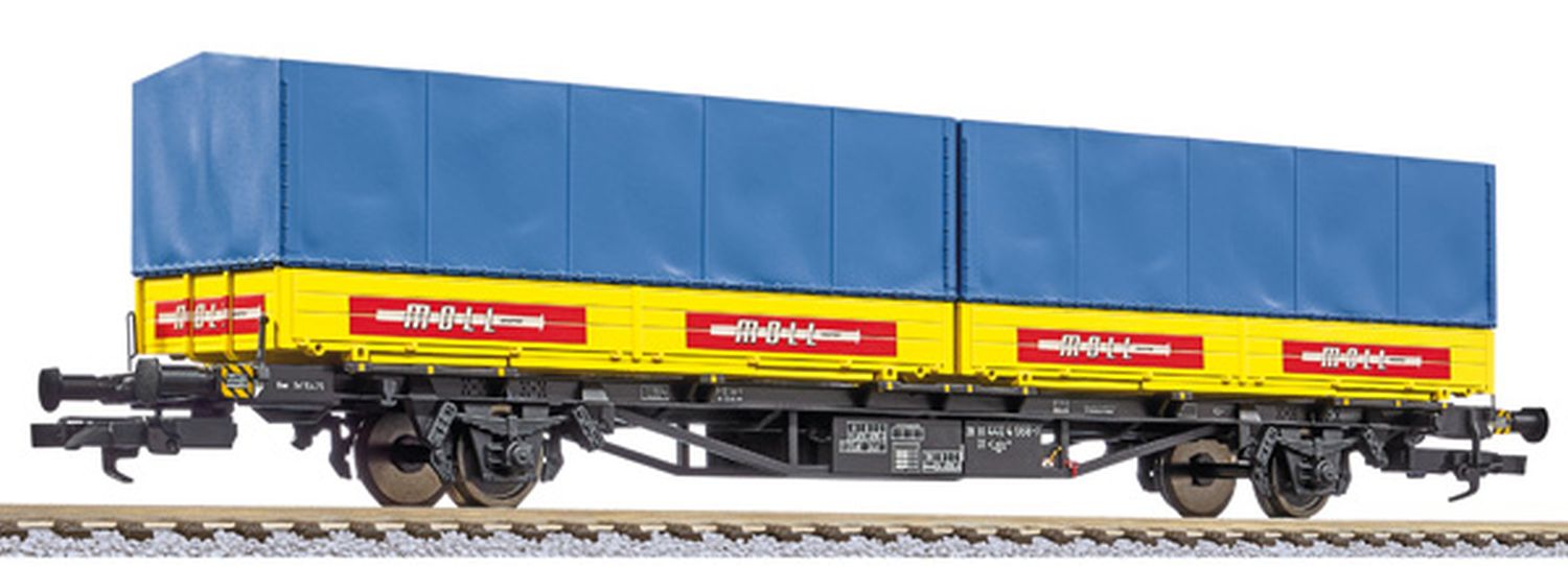 Containertragwagen, Bauart Lgjs 571 der DB, Betriebszustand 1980, LüP 196,5 mm, mit Wechselpritschen der Spedition „MOLL“