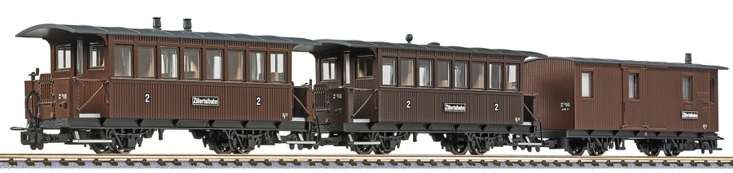 3-teiliges Zugset der Zillertalbahn, bestehend aus einem 2-achsigen Personenwagen Bi / s 17, einem 2-achsigen Personenwagen Bi / s 20 und einem 2-achsigen Dienstwagen PF/ s 51, LüK je Wagen 97 mm.