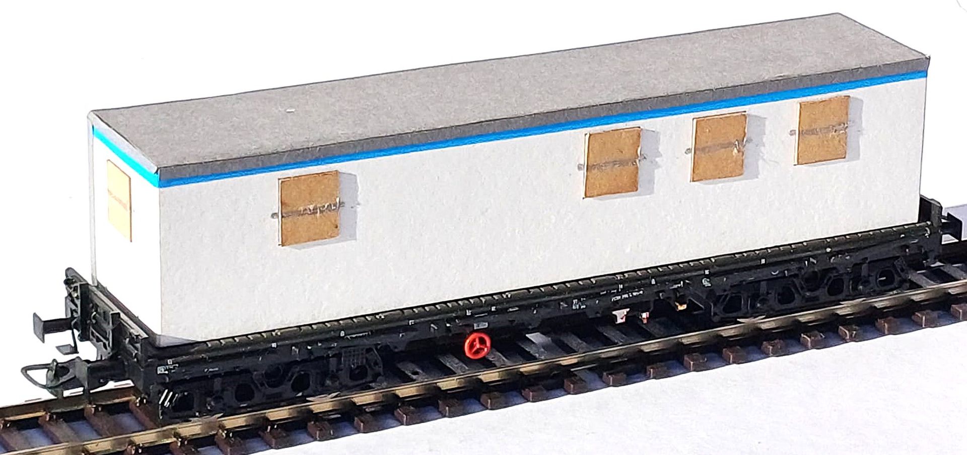 Ladegut „ATCO-Tainer“ – Typ C (N / 1:160) Modell einer modularen Gebäudeeinheit, dem Vorbild entsprechend nur an einer Seitenwand verkleidet und mit Schutzplane am Dach; passend für alle Kbs / Laas / Rmms und Remms- Wagen und ähnliche; Länge: ca. 76 mm