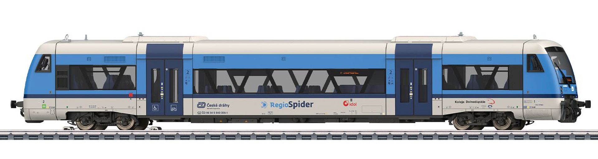 Vorbild: Dieseltriebwagen vom Typ Regio Shuttle RS1 als Baureihe 840 der Tschechischen Staatsbahn (C?D). Ausführung mit Schraubenkupplung, Puffern und tief liegender Zugzielanzeige. Lichtgrau/Himmelblaue Grundfarbgebung. Betriebsnummer 840 006-1. Betriebszustand ab 2020.