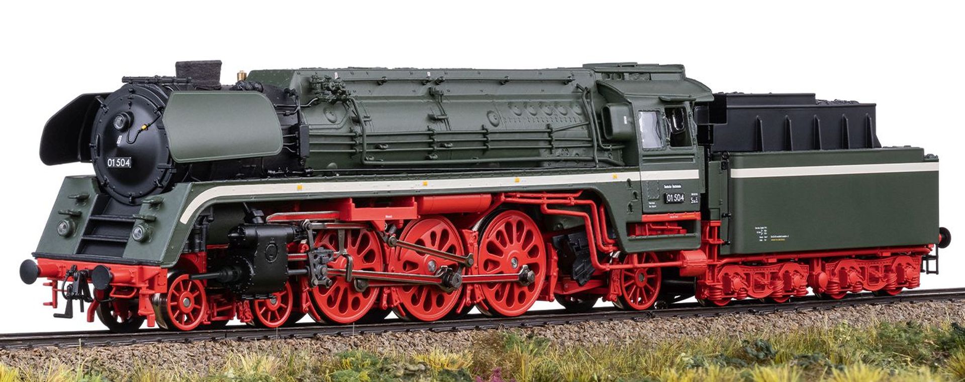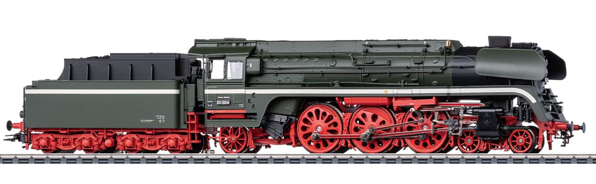 Vorbild: Schnellzug-Dampflokomotive Baureihe 01.5, mit Kohlen-Schlepptender 2´2´T34. Reko-Ausführung der Deutschen Reichsbahn der DDR (DR/DDR). Dunkelgrüne Grundfarbgebung mit weißen Zierstreifen. Mit Boxpok-Räder, Witte-Windleitblechen in spezieller Bauform für die BR 01.5, durchgehender Domverkleidung und seitlicher Verkleidung der Umlaufbleche. Lok-Betriebsnummer 01 504. Betriebszustand um 1964.