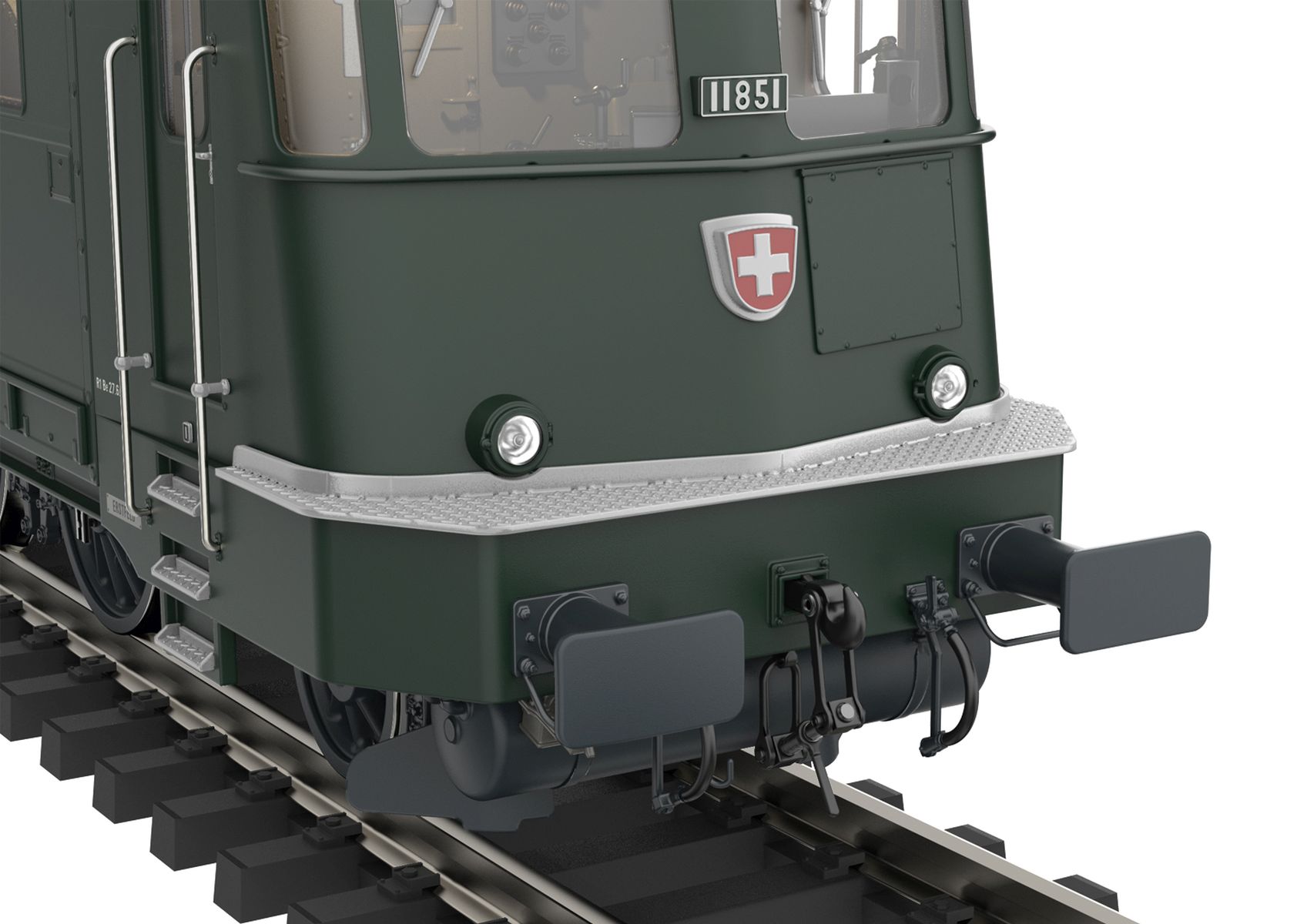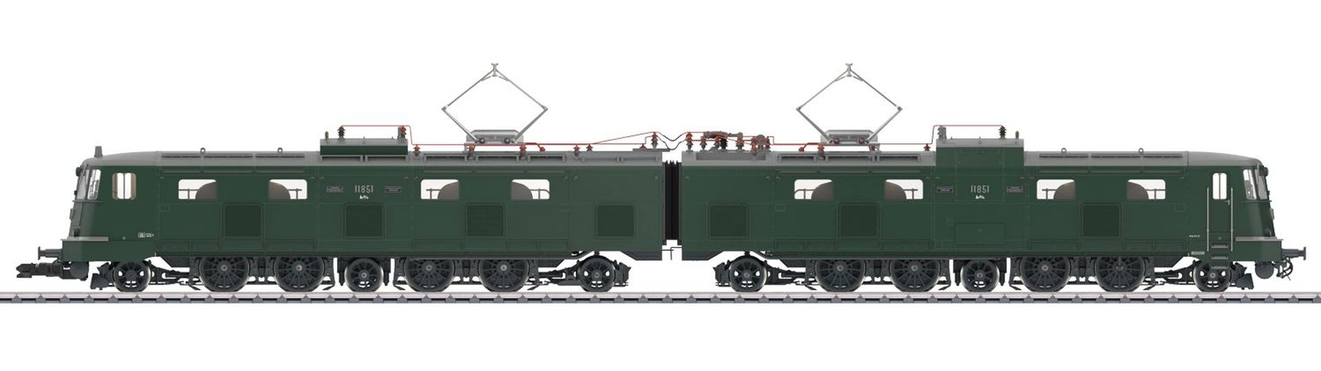 Vorbild: Elektrolokomotive Serie Ae 8/14 Nr. 11851 der Schweizerischen Bundesbahnen (SBB) im Zustand nach dem im Jahre 1961 erfolgten beidseitigen Umbau auf Führerstände der SBB Serie Ae 6/6 in tannengrüner Grundfarbgebung der Epoche IV, Betriebszustand 1969 bis 1976.