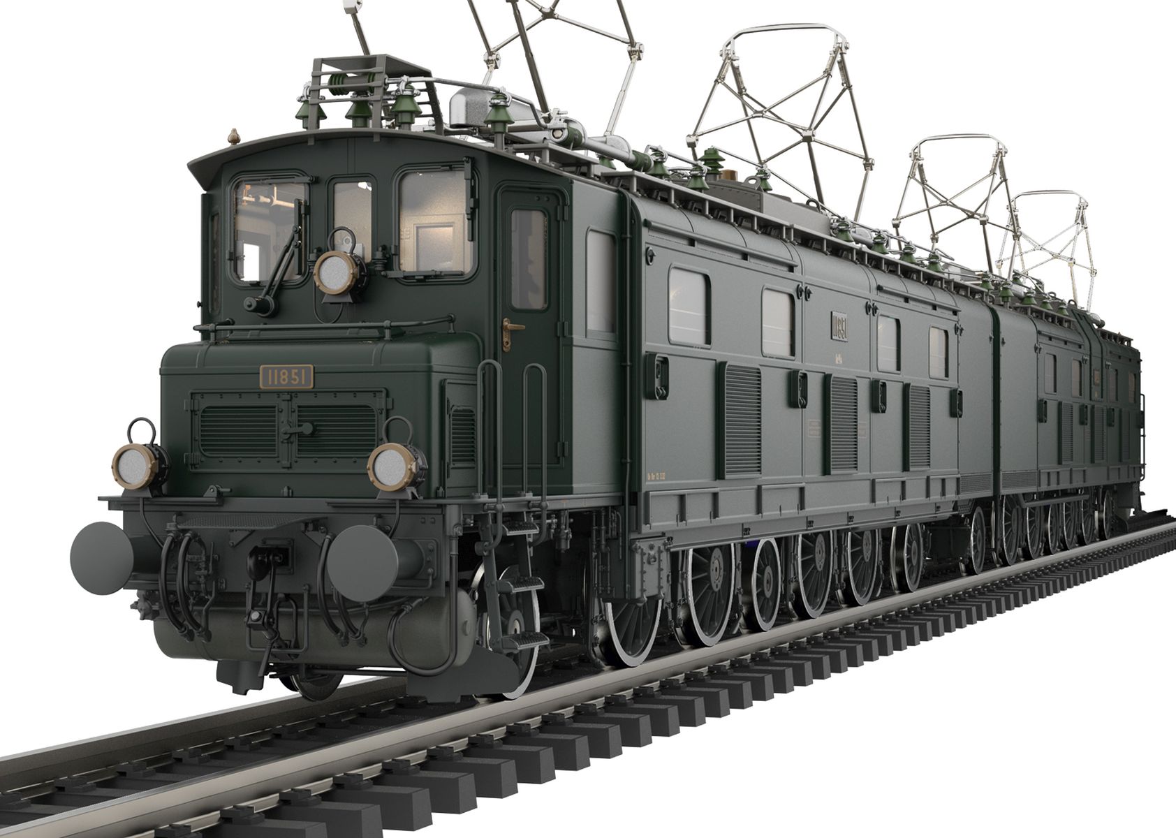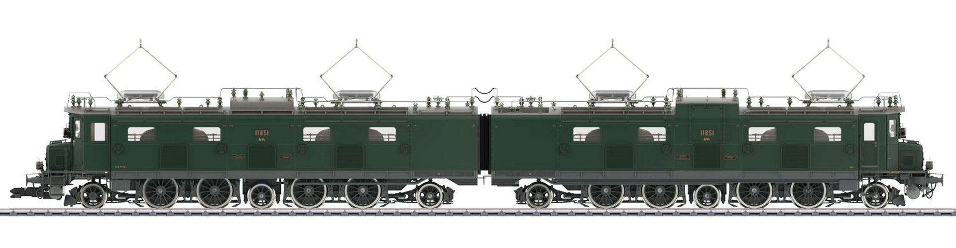 Vorbild: Elektrolokomotive Serie Ae 8/14 Nr. 11851 der Schweizerischen Bundesbahnen (SBB) in tannengrüner Grundfarbgebung ihres Auslieferungszustandes von 1932. Die Lok war bis 1938 in diesem Zustand in Betrieb. Epoche II.