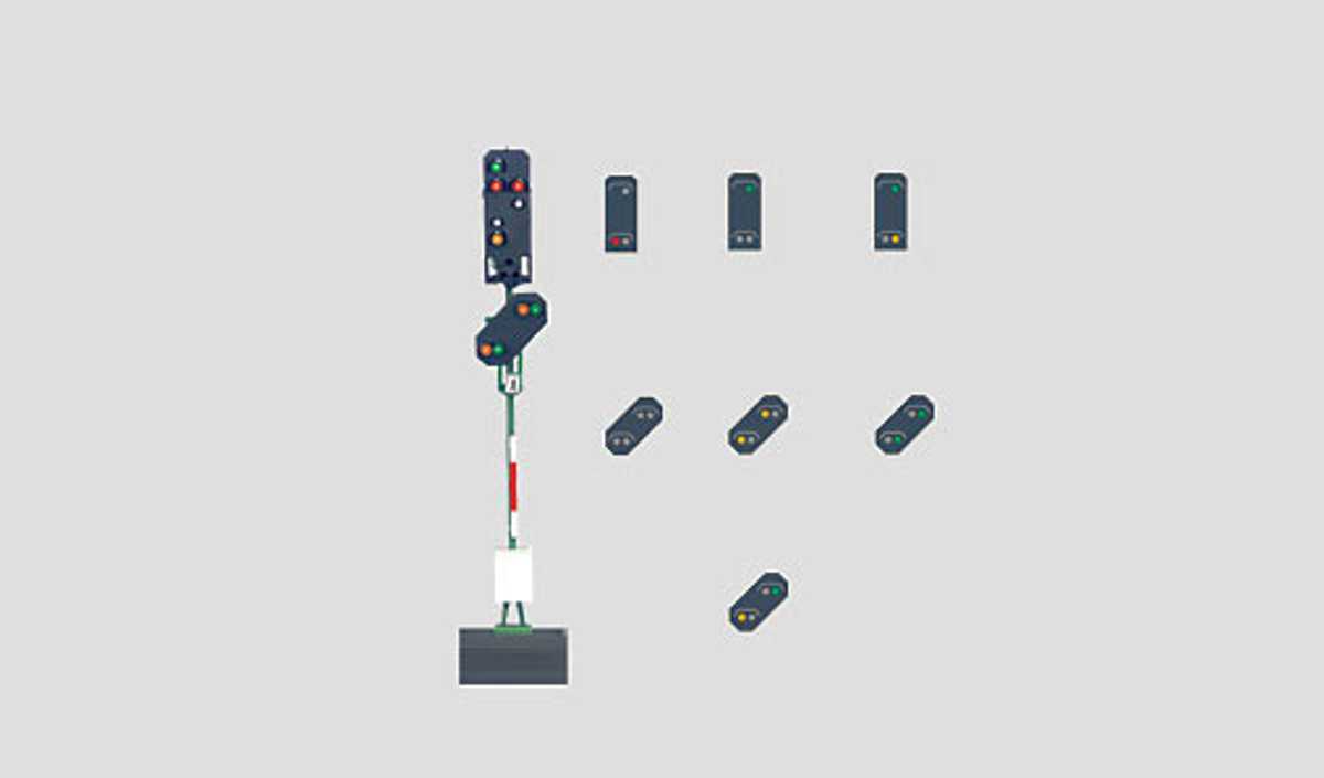 2 Signale an einem Mast ohne zusätzlichen Anschluss. Ausfahrsignal für den Einsatz am Bahnhofsende, bzw. der Einfahrt auf die Hauptstrecke. Vorsignal für den Einsatz vor einem Block- oder Einfahrsignal.
