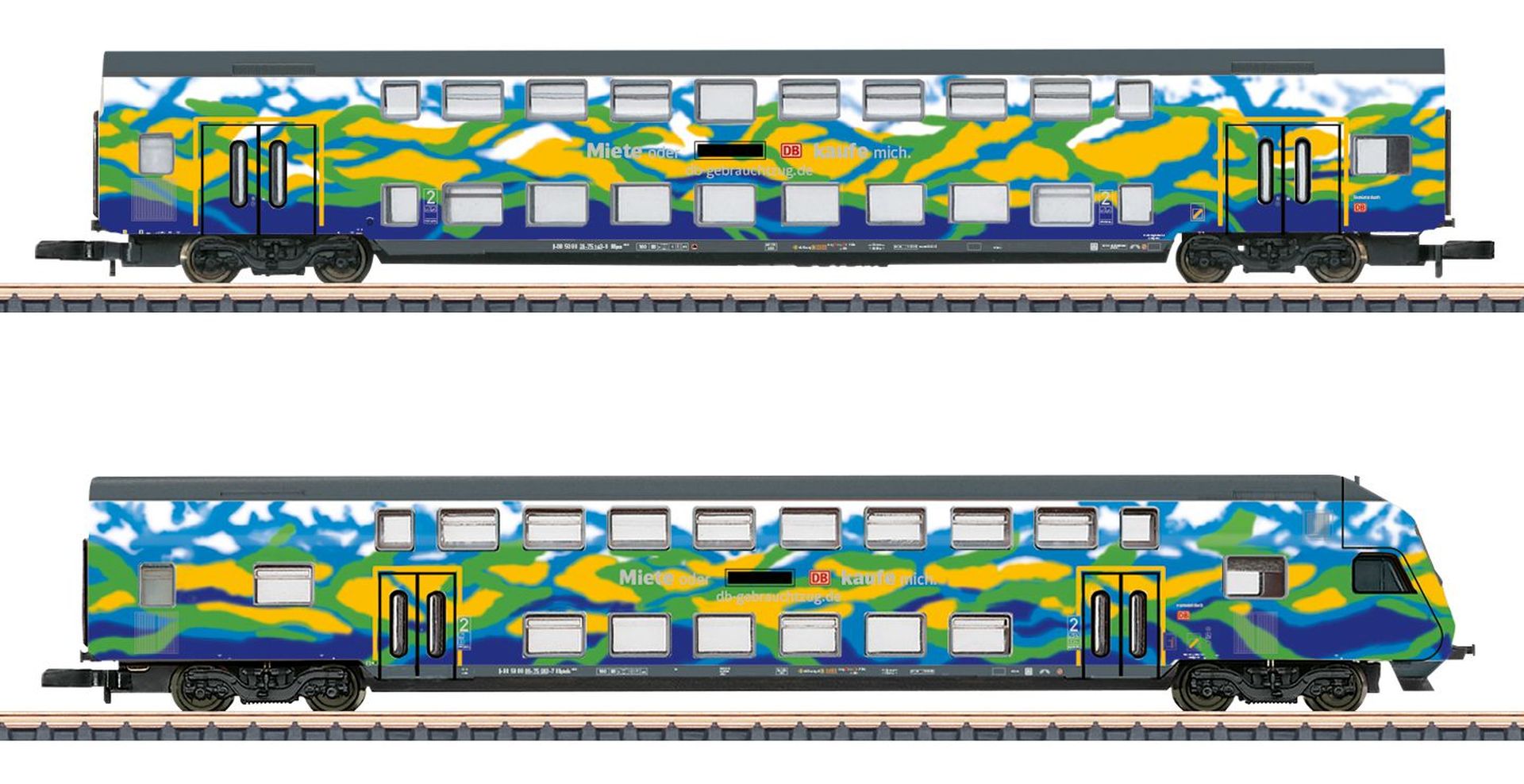 Vorbild: 1 x Doppelstock-Mittelwagen DBpza 753.5 und 1 x Doppelstock-Steuerwagen DBpbzfa 765.6 der DB AG, Geschäftsbereich DB-Gebrauchtzug. Aktueller Zustand der Epoche VI.