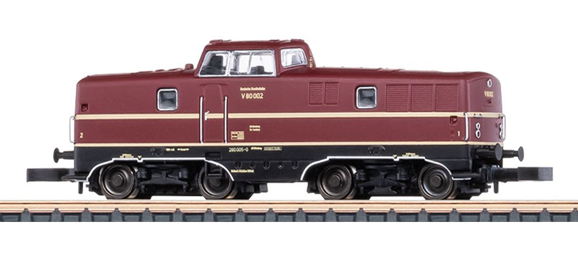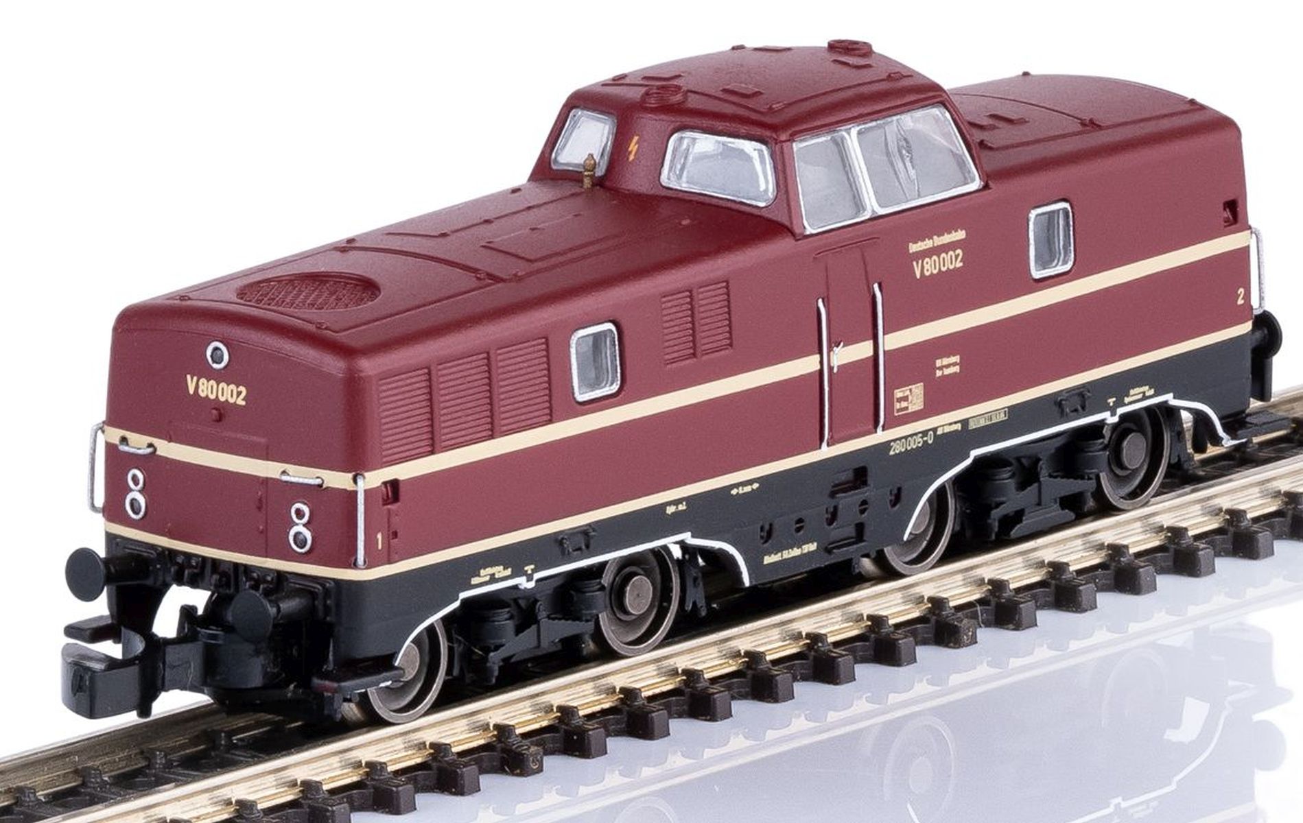 Vorbild: Museums-Mehrzweck-Diesellokomotive Baureihe V 80 der Deutschen Bahn (DB) in roter Grundfarbgebung. Ausführung mit einer Einzellampe oben und Doppellampen unten. Im Betriebszustand wie die Lok im Jahr 2000 im DB-Museum Nürnberg ausgestellt wurde.