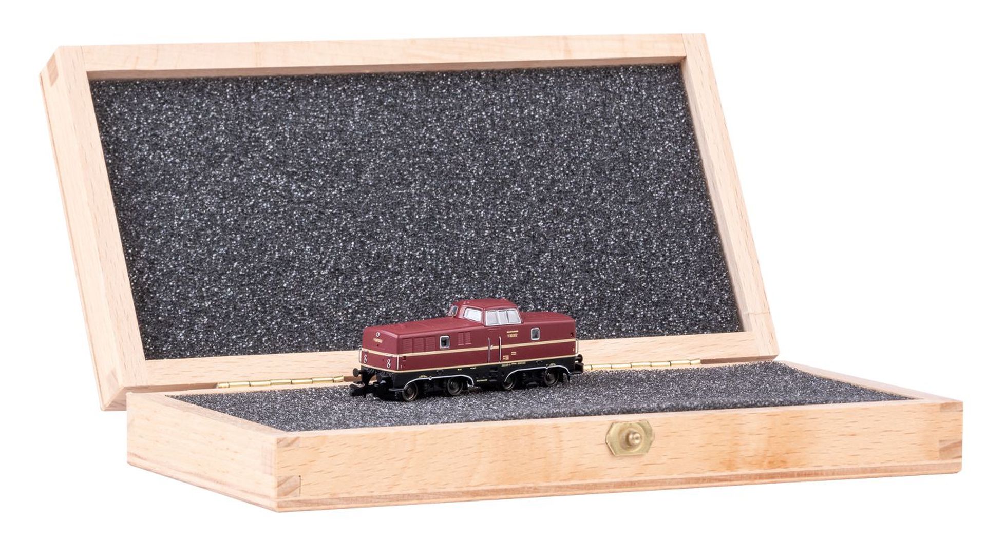 Modell: Ausführung der Epoche III mit runden Metallpuffern. Fahrwerk aus Metall/Kunststoff, Aufbau aus Kunststoff. Vergrößerte Pufferteller. Alle Achsen angetrieben, Glockenankermotor, Dreilicht-Spitzenbeleuchtung mit warmweißen LEDs mit der Fahrtrichtung wechselnd. Dunkel vernickelte Radkränze. Nachbildung Führerstandseinrichtung. Länge über Puffer ca. 58 mm. Verpackt in einer Echtholzbox.