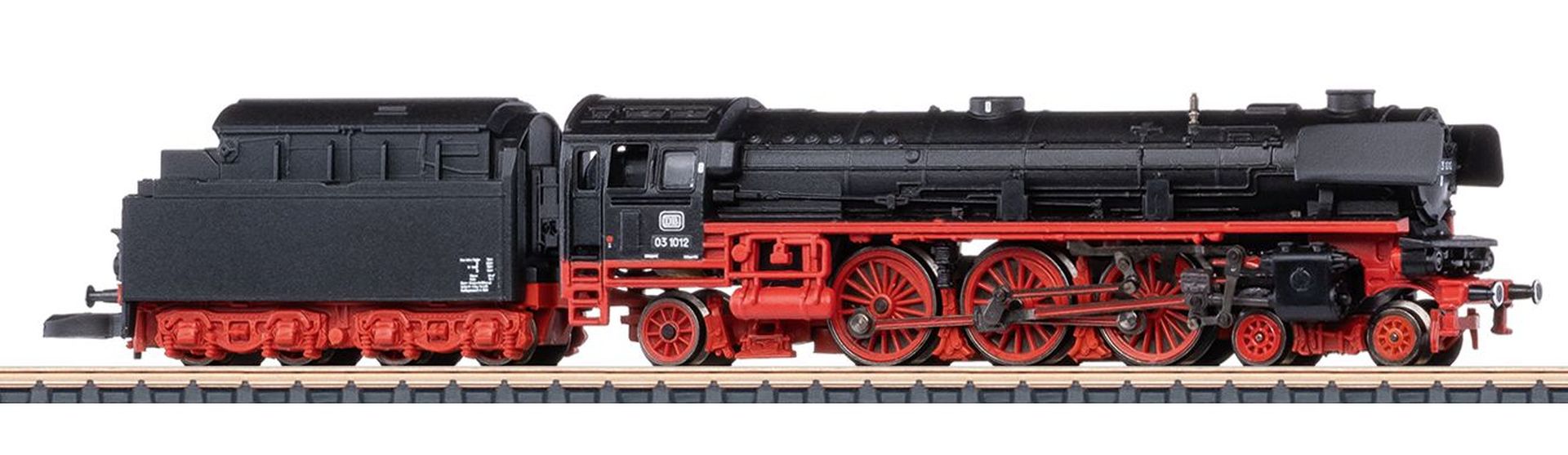 Vorbild: Schnellzug-Dampflokomotive Baureihe 03.10 (03 1012) mit Hochleistungs-Neubaukessel der Deutschen Bundesbahn (DB) im Zustand der Epoche III um 1961. Unverkleidete Umbauversion mit Witte-Windleitblechen. Vorlaufräder als Speichenräder ausgeführt.