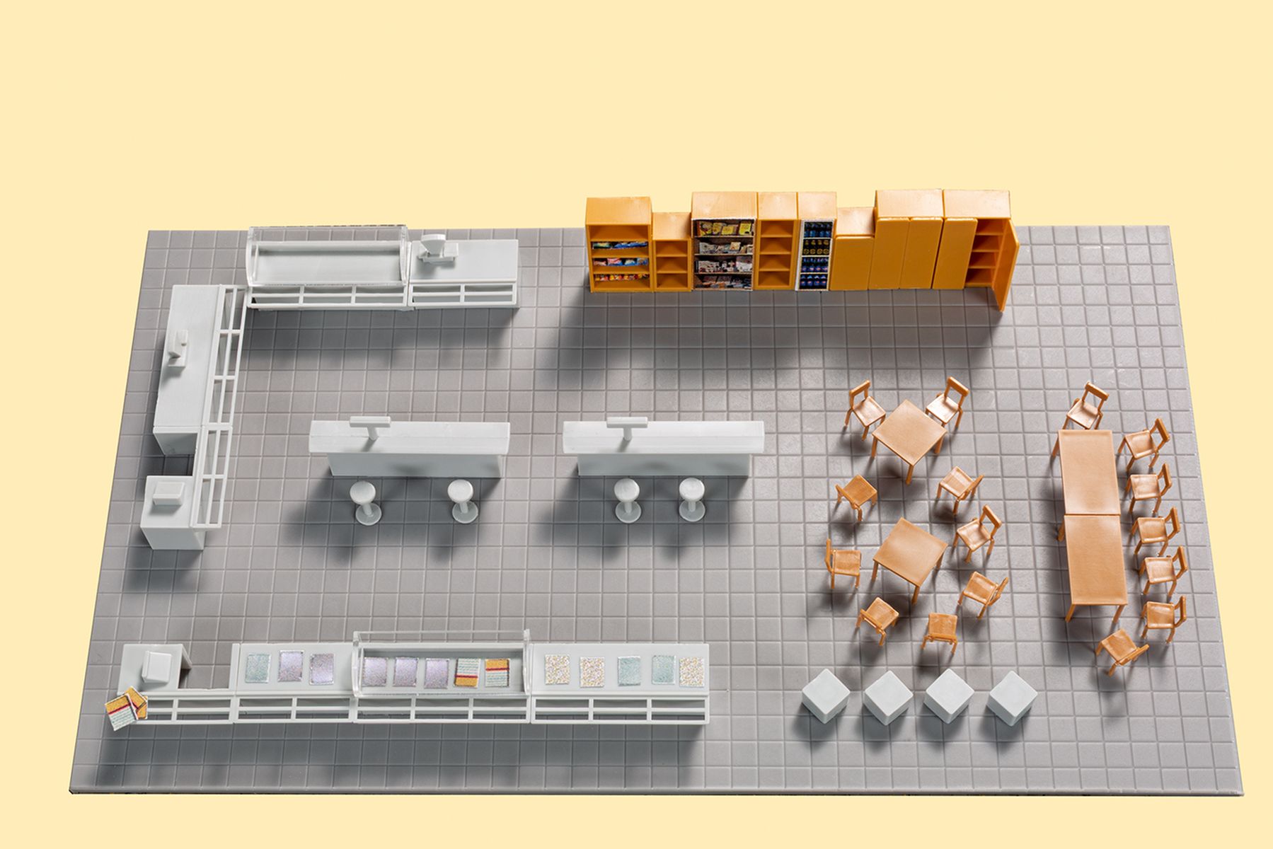Ideal zur Ausgestaltung von modernen Verkaufsräumen, Cafés oder kleinen Gaststätten. Die umfangreiche Ausstattung umfasst eine Theke mit Ausschank, passende Barhocker sowie einen separaten Kassentisch. Ergänzt wird das Set durch zwei große und zwei kleine Tische, insgesamt 16 Stühle sowie verschiedene Schränke. Die Schranktüren lassen sich je nach Wunsch offen oder geschlossen darstellen. Groß…