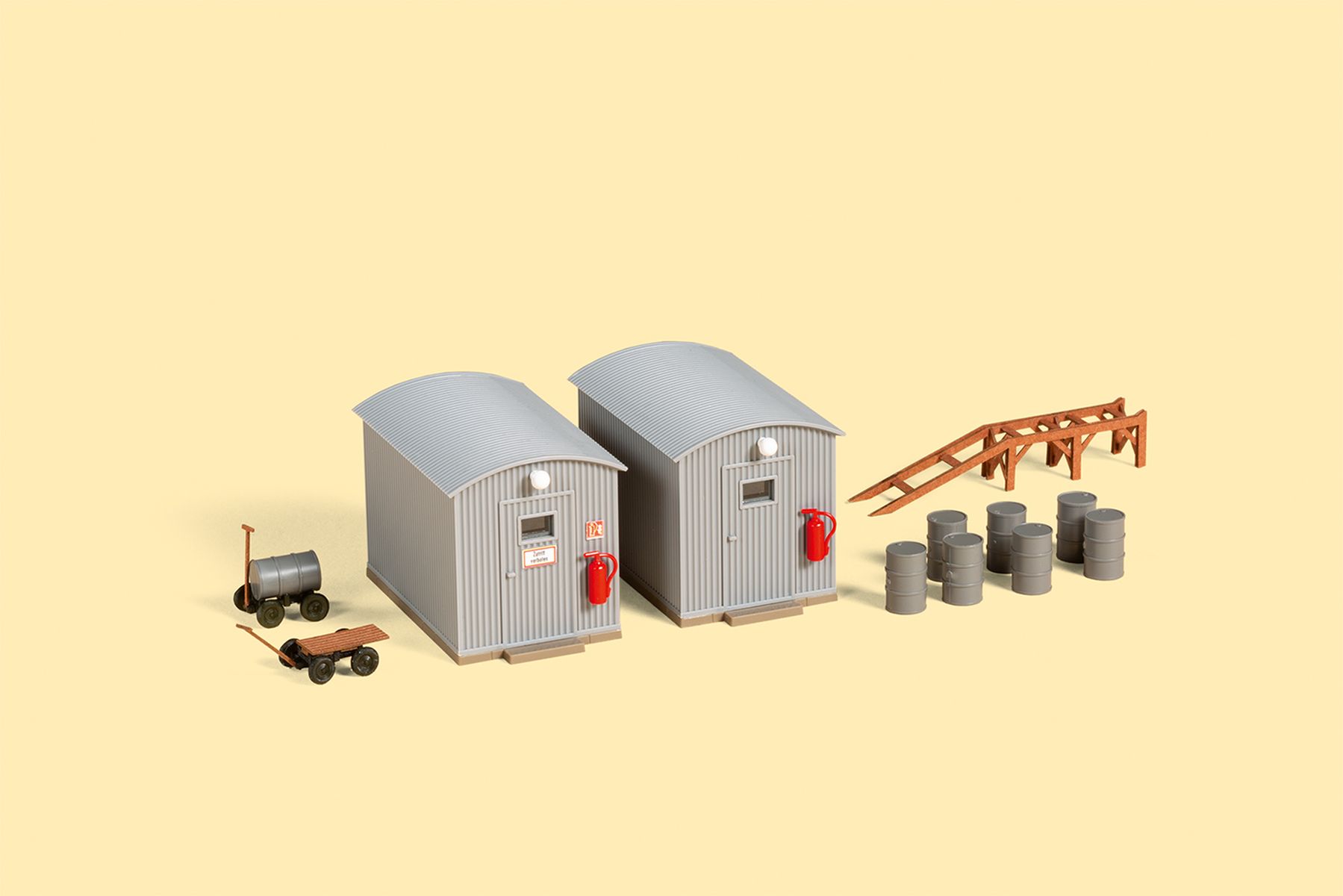 Zwei typische Wellblechhütten, wie sie vielerorts als Öllager zum Einsatz kamen. Die Hütten lassen sich vielseitig einsetzen – einzeln oder als Ensemble. Eine Rampe aus stabilem Karton in Lasercut-Technologie liegt bei und erleichtert das Be- und Entladen. Zum Zubehör gehören mehrere Fässer sowie zwei Varianten eines Fasswagens…
