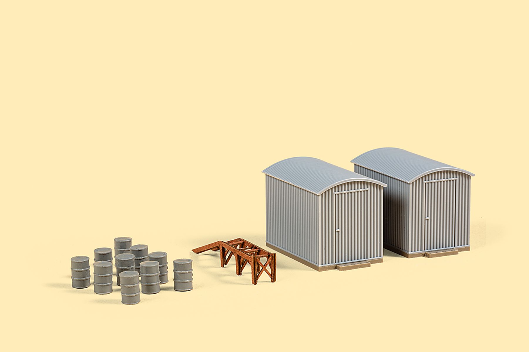 Zwei Wellblechhütten in typischer Bauform, wie sie als Öllager auf Werksgeländen oder in Bahnbereichen verwendet wurden. Zum Zubehör gehören eine Rampe aus stabilem Karton in Lasercut-Technologie sowie mehrere Fässer zur Ausgestaltung. Die Schuppen lassen sich flexibel platzieren und sin…