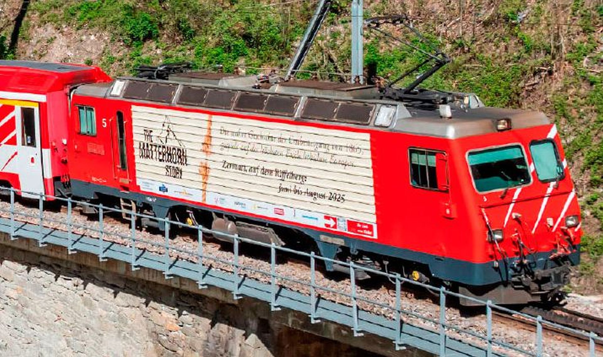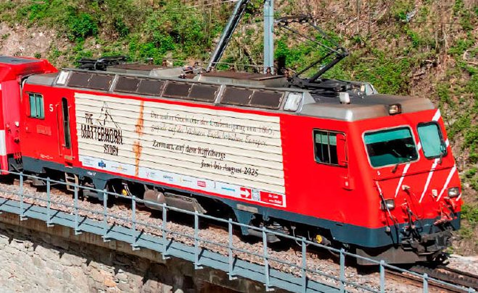 Die MGB hat eine ihrer nicht modernisierten Zahnradloks HGe 4/4 3-5 ex BVZ anlässlich der Freilichtspiele auf dem Riffelberg – der höchst gelegenen Freilichtbühne Europas – plakatiert. Die Aufführung erinnert an die Erstbesteigung des Matterhorns im Juli 1865 und damit an die touristischen Anfänge einer heute vielbesuchten Region. Zehn Jahre nach der Erstau…