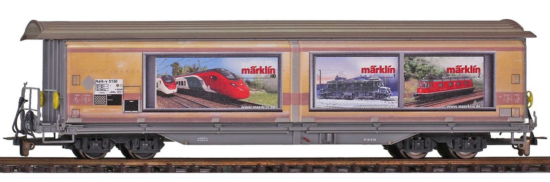 Im Frühjahr 2025 hat die Firma Märklin einen Schiebewandwagen der Serie Haik-v 5121-5135 mit Modellbahnmotiv-Plakaten ihrer verschiedenen Spurweiten H0, 1 und Z sowie auf der anderen Wagenseite ihrer Marken LGB, Trix und Minitrix gestaltet.