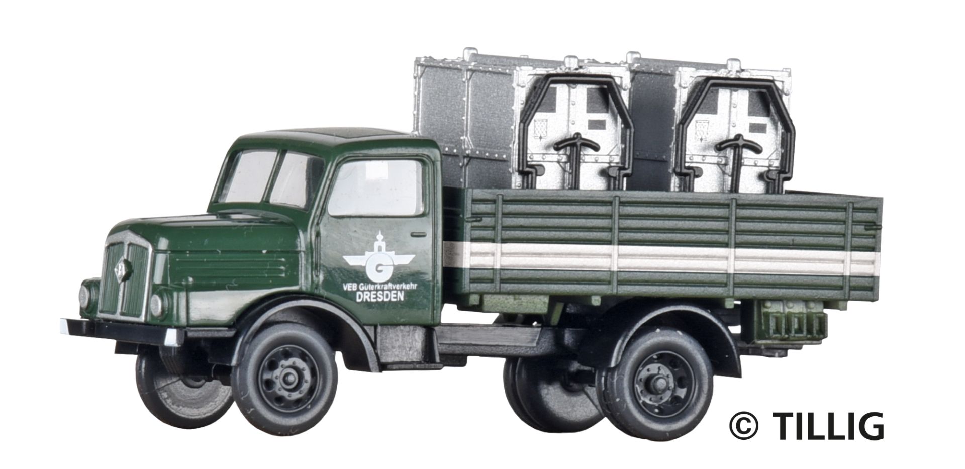 Tillig 19078 - LKW H3A Hochbordpritsche 'VEB Güterverkehr Dresden', beladen mit Rollgutbehältern