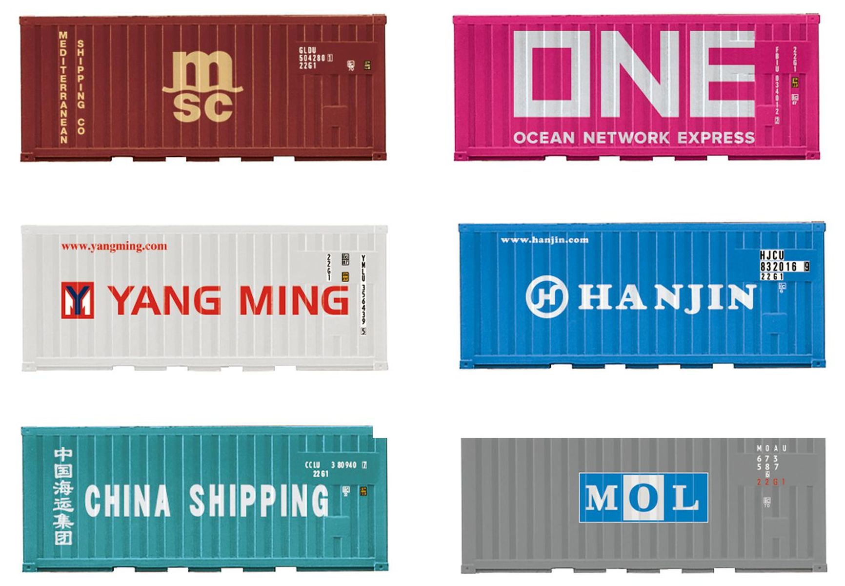 Vorbild: Sechs 20ft.-Standard-Boxcontainer unterschiedlicher Firmen. Aktueller Betriebszustand der Epoche VI