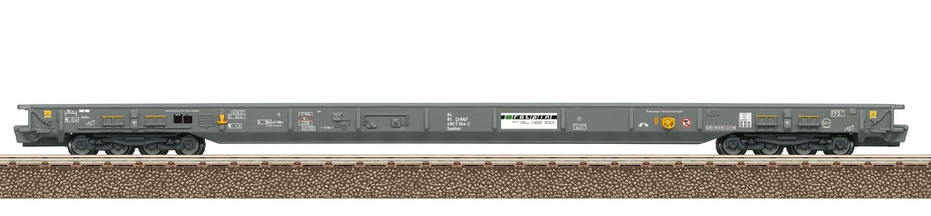 Vorbild: Niederflurtransportwagen Bauart Saadkms der RAlpin AG (Olten), für den Transitverkehr der „Rollenden Landstraße“. Quarzgraue Grundfarbgebung. Betriebszustand ab 2018.