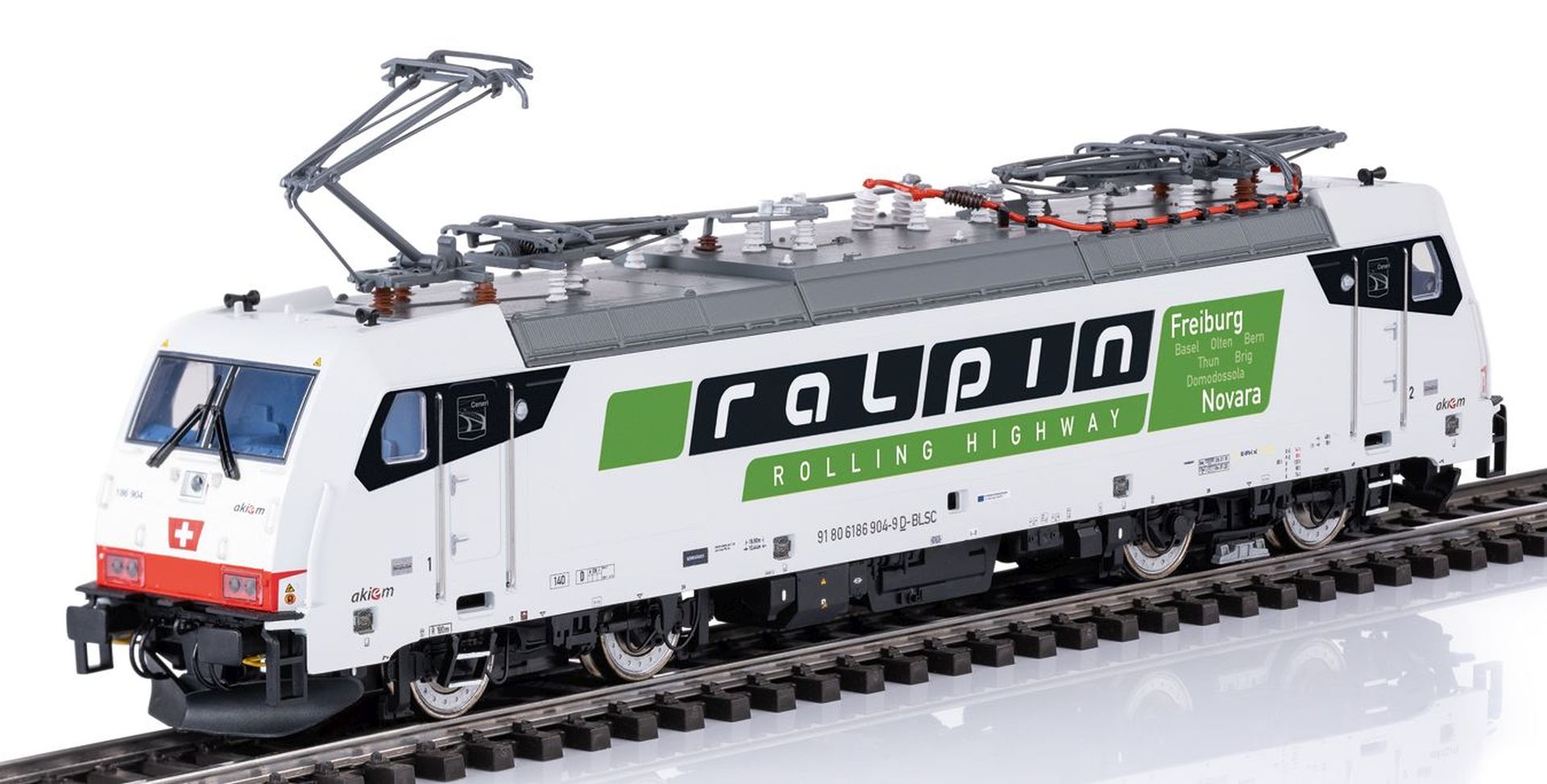 Vorbild: Elektrolokomotive Baureihe 186 der Akiem SAS, vermietet an die SBB Cargo International. Lichtgraue Grundfarbgebung mit zwei unterschiedlich gestalteten Seitenflächen. Betriebsnummer 186 904-9 „Ceneri“. Betriebszustand ab 2022.