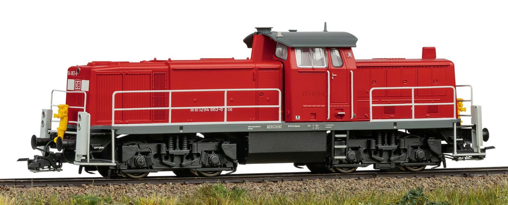 Vorbild: Schwere Diesel-Rangierlokomotive Baureihe 294 der Deutschen Bahn AG. Verkehrsrote Grundfarbgebung. Betriebsnummer 294 863-6. Betriebszustand ab 2007.