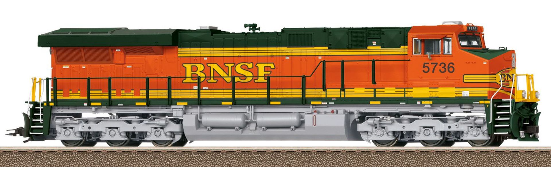 Vorbild: Schwere dieselelektrische Güterzuglokomotive Typ General Electric ES44AC der Burlington Northern Santa Fe, LLC (BNSF). Orange Grundfarbgebung. Betriebsnummer 5736. Aktueller Betriebszustand.