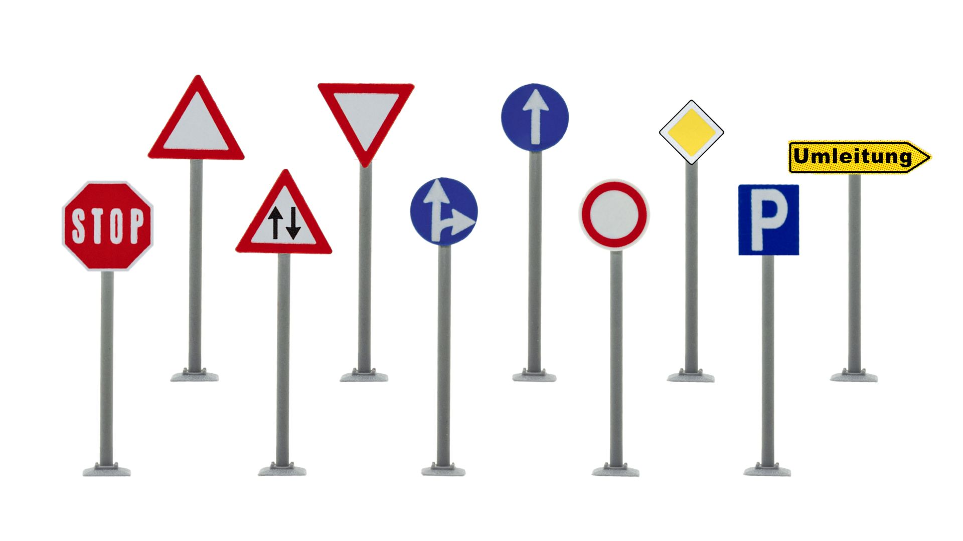 Durch die beiliegenden Aufkleber können Sie selbst bestimmen, welches Schild Sie benötigen. Eine schöne Ergänzung zum Viessmann CarMotion-System. Bestehend aus zehn Schildern und einem Deko-Bogen mit Schildern zum Aufkleben.