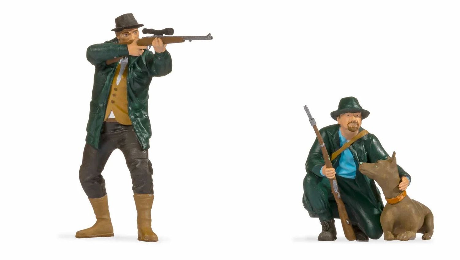 Das Figurenset enthält 2 Figuren. Ein Jäger steht mit seinem Gewehr da und zielt auf ein Reh. Er hat typische Jägerkleidung an, so trägt er einen Filzhut, hat eine grüne Jacke und dunkelbraune Hosen sowie Lederstiefel an. Der andere Jäger trägt ebenfalls traditionelle Jägerkleidung. Er sitzt auf dem Boden und streichelt seinen Jagdhund, der neben ihm Platz gemacht hat. Er hat sein Gewehr umgehängt.