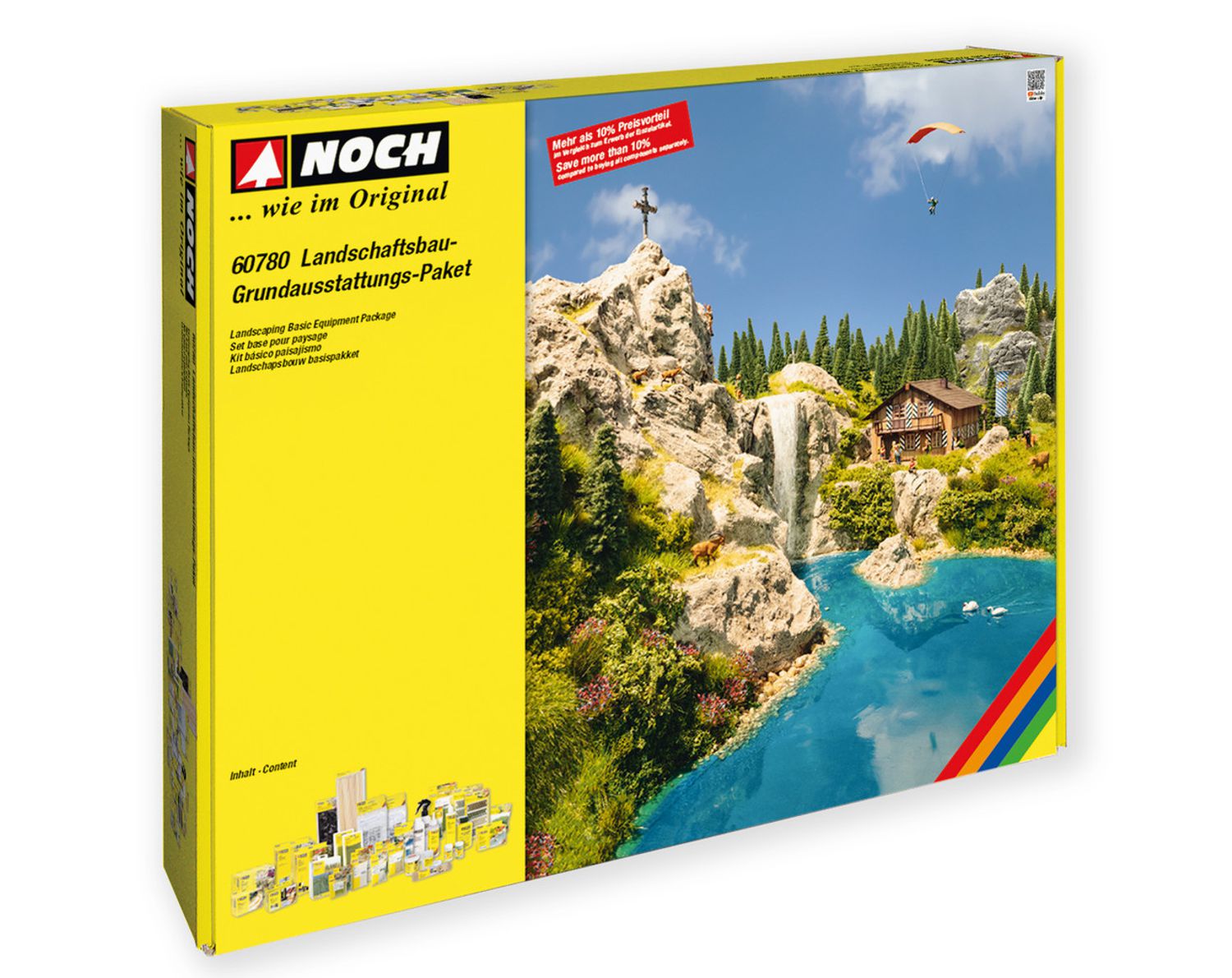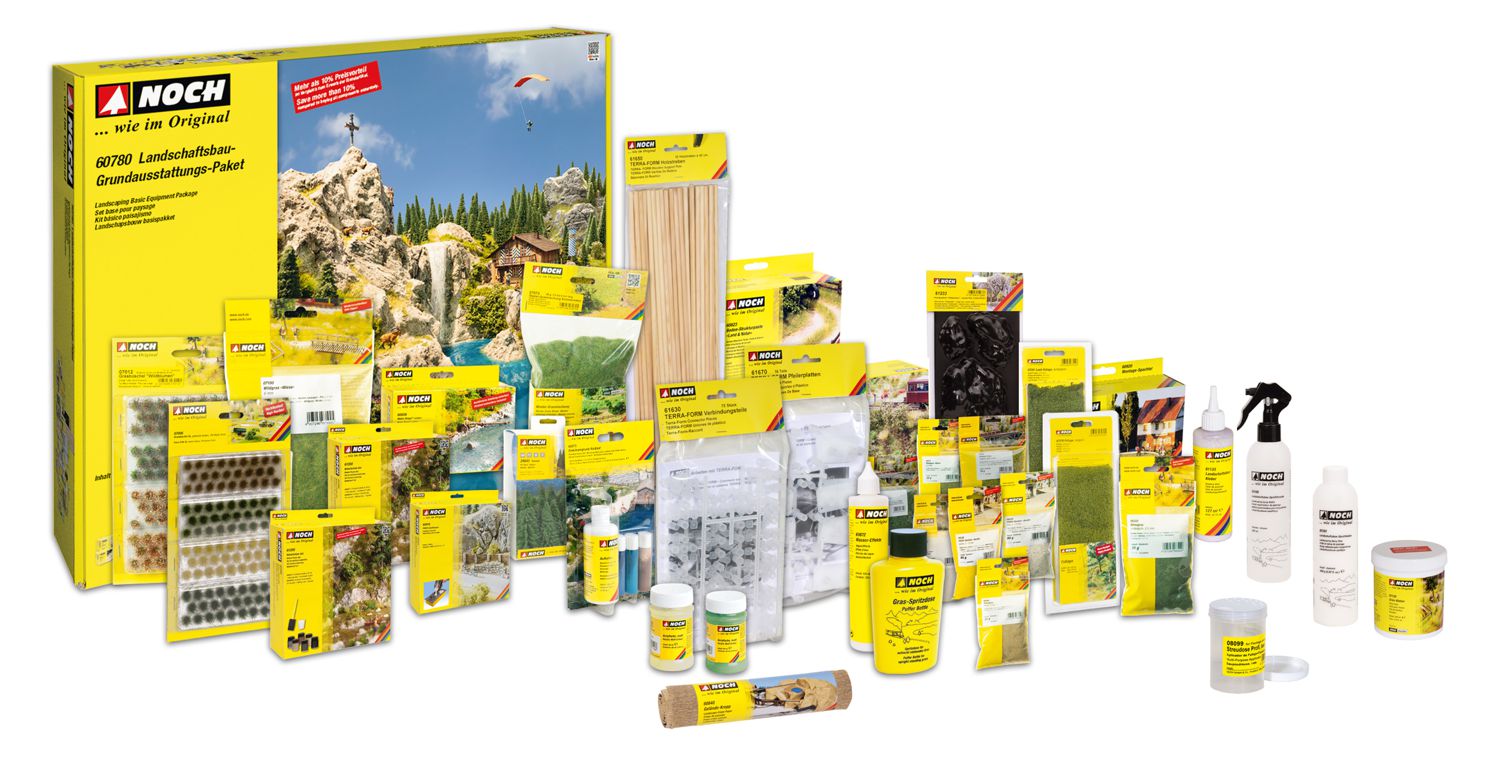 Die Grundausstattung für den Profi-Modell-Landschaftsbauer! Landschaftsbau-Grundausstattungs-Paket Mit dem NOCH "Landschaftsbau-Grundausstattungs-Paket" haben Sie alles, was Sie benötigen, um mit dem professionellen Bau einer Landschaft zu beginnen. Egal, ob Sie eine Modellbahn mit einer Landschaft versehen wollen, oder den Einstieg in den hochwertigen Dioramenbau suchen: Die enthaltenen Materialien eignen sich ideal für viele Spurweiten und Maßstäbe. In Verbindung mit dem NOCH Easy-Track Modellbahn-Trassenbausatz ist das Set Ihr idealer Start in den einfachen Bau einer Modellbahn-Anlage. Das Paket ist die ideale Erstausstattung für jeden Modellbauer. Die Verwendung der einzelnen Produkte ist sehr einfach und besticht durch ein perfektes Ergebnis. Jeder Artikel enthält Verarbeitungs- und Anwendungshinweise. Beachten Sie hierzu auch die NOCH Home Academy mit dem Online-Seminar "Urlaub in den Bergen". Alle in der Grundausstattung enthaltenen Produkte werden ausführlich im Video-Seminar gezeigt, erklärt und verarbeitet. Zum Video-Seminar! Die NOCH Home-Academy - Online-Video-Seminar "Urlaub in den Bergen"In der NOCH Home Academy erlernen Sie vom Seminar-Leiter und NOCH Geschäftsführer Sebastian Topp die professionelle Gestaltung einer Berg-Landschaft. Kernthema des Online-Video-Seminars sind Felsbau, Gewässergestaltung, elektrostatische Begrasung, Laser-Cut Modellbau und die realistische Dekoration einer Landschaft. Dabei lernen Sei alle Produkte aus dem Grundausstattungs-Paket kennen, erfahren, wie man diese richtig verwendet und profitieren von jeder Menge Tipps & Tricks. Das Online-Seminar können Sie kostenfrei uns rund um die Uhr ansehen. Wir wünschen Ihnen viel Spaß beim Zuschauen und Mitmachen! Artikelnummer Artikelbezeichnung 07006 Grasbüschel XL gedeckte Farben, 104 Stück, 9 mm 07012 Grasbüschel "Wildblumen" 52 Stück, 6 mm und 52 Stück, 9 mm 07072 Master-Grasmischung "Sommerwiese", 2,5 bis 6 mm, 50 g 07100 Wildgras "Wiese" 6 mm, 50 g 07270 Foliage hellgrün, 20 x 23 cm 07301 Laub-Foliage dunkelgrün, 20 x 23 cm 07351 Struktur-Flock hellgrün, grob, 10 g 07352 Struktur-Flock mittelgrün, grob, 10 g 08099 Streudose PROFI, leer 08100 Gras-Spritzdose 08312 Streugras "Wiese" 2,5 mm, 20 g 08322 Streugras mittelgrün, 2,5 mm, 20 g 08362 Streugras beige, 4 mm, 20 g 09228 PROFI-Gestein "Geröll", fein, 80 g 09230 PROFI-Gestein "Geröll", mittel, 80 g 09237 Kies, 250 23102 Bahndammbewuchs 60823 Boden-Strukturpaste "Land & Natur" 100 g Sand (beige), 100 g Lehm (ocker) 100 g Erde (braun) 24643 Tannen, 16 Stück, 4 – 10 cm hoch 60840 Gelände-Krepp, 90 x 80 cm 60856 Water-Drops® "color", 250 g transparent, ergibt ca. 300 ml sowie je 25 g blau, grün und braun 60872 Wasser-Effekte, 130 g 60875 Gewässergrund-Farbset, 100 ml Basisfarbe und je 10 ml Konzentrat blau, grün und braun 60918 PROFI-Gießmasse, 1000 g, ergibt ca. 800 ml 60920 Montage-Spachtel, 500 g 61130 Gras-Kleber, 250 g 61133 Landschaftsbau-Kleber, 127 g 61140 Landschaftsbau-Sprühflasche, leer 61141 Landschaftsbau-Sprühleim, 250 g, sprühfertig gemischt 61191 Acrylfarbe, matt, elfenbein, 90 ml 61194 Acrylfarbe, matt, hellgrün, 90 ml 61200 Naturfarben-Set, 6 Farbkonzentrate, je 20 ml 1 Mischbecher, 1 Schwamm-Tupfer 61233 Fels-Gussform "Widderstein", 1 großer Fels, 2 kleine Felsen 61630 TERRA-FORM Verbindungsteile, insgesamt 72 Teile 61650 TERRA-FORM Holzstreben, je 40 cm lang, 35 Stück 61670 TERRA FORM Pfeiler-Platten, insgesamt 16 Teile Hinweis: Je nach Verwendung der Materialien reicht der Inhalt des Pakets unterschiedlich weit. Die Reichweiten einiger Inhalte wie z. B. TERRA-FORM Artikel, Montage-Spachtel, Gießmasse etc. sind davon abhängig, welche Geländeform Sie bauen möchten. Je höher und bergiger Sie bauen, desto mehr benötigen Sie. Ausgestaltungsmaterialien wie z. B. Grasfasern, Büschel, Bahndammbewuchs etc. sind in der Reichweite abhängig von der Intensität, in der Sie diese verwenden. Wenn Sie Büschel einzeln als Deko-Highlights einsetzen, kommen Sie damit natürlich weiter, als wenn Sie Wildgras- oder Wildblumenwiesen mit dichtem Bewuchs gestalten. Andere Artikel wie z. B. die Fels-Gussformen könnenbeliebig oft verwendet werden und die Menge der enthaltenen Klebstoffe ist ebenfalls sehr ergiebig. Daher ist eine pauschale Aussage über die Reichweite des Pakets als Ganzes nicht möglich. Orientieren Sie sich anhand der Tabelle zu den genauen Inhalten. Sie können nachträglich auch alle Artikel einzeln nachkaufen, sodass Sie gezielt die, für Sie persönlich wichtigen Artikel beziehen können. Im Paket sind keine Figuren und Gebäude enthalten.