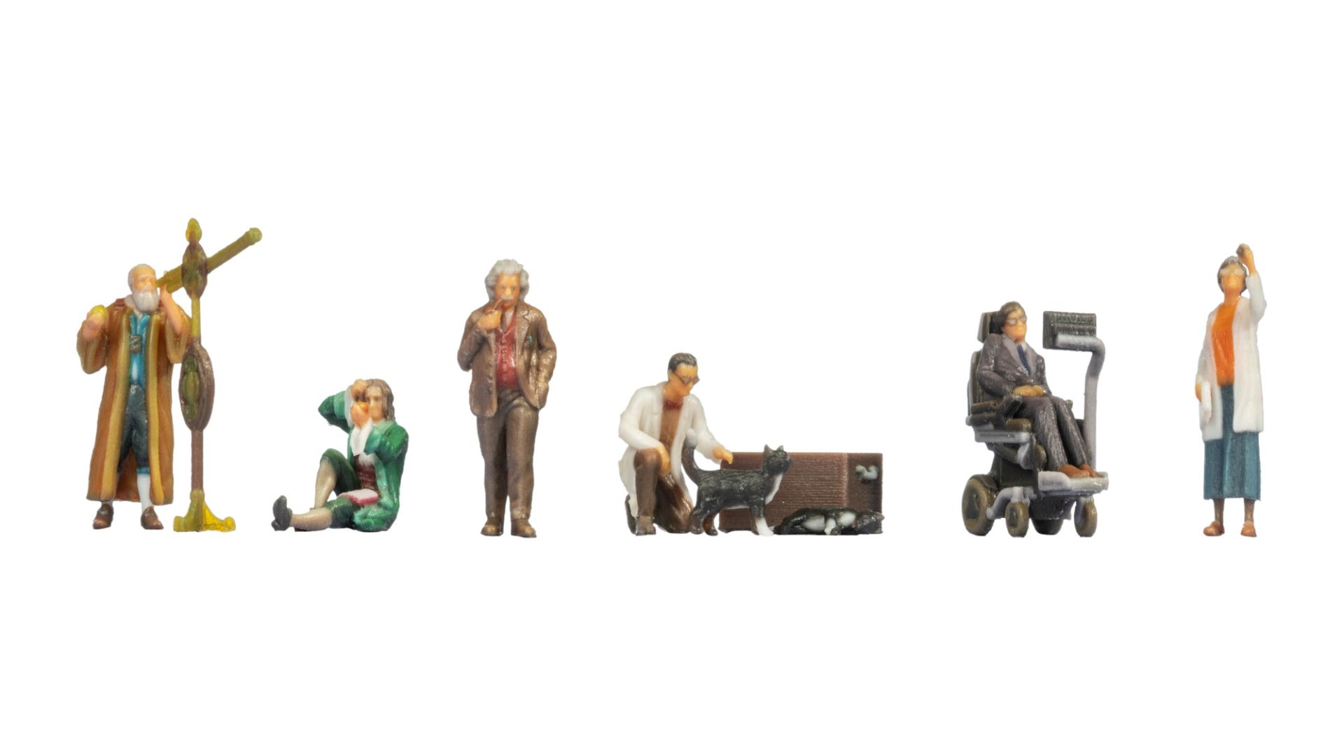 Zum Lieferumfang gehören exklusive 3D-Figuren bedeutender Persönlichkeiten der Astronomie und Physik: Isaac Newton, Galileo Galilei, Albert Einstein, Erwin Schrödinger, Stephen Hawking und Vera Rubin. Ergänzt wird das Ensemble durch eine lebende und eine tote Katze als augenzwinkernde Anspielung auf Schrödingers Gedankenexperiment.