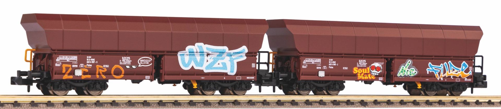 Das Modell verfügt neben zuverlässig funktionierenden Kurzkupplungskulissen für den Ganzzugeinsatz vorbildgerecht über sämtliche Details des Vorbilds, wobei Griffstangen, Handräder und Bremserbühnen in der erforderlichen filigranen Ausführung gesondert und damit freistehend angesetzt sind. Zweierset bestehend aus zwei Schüttgutwagen vom Typ Falns von OnRail in der Epoche VI. Die Seiten der beiden Wagen sind mit unterschiedlichen, detailreich ausgestalteten Graffitis verziert.