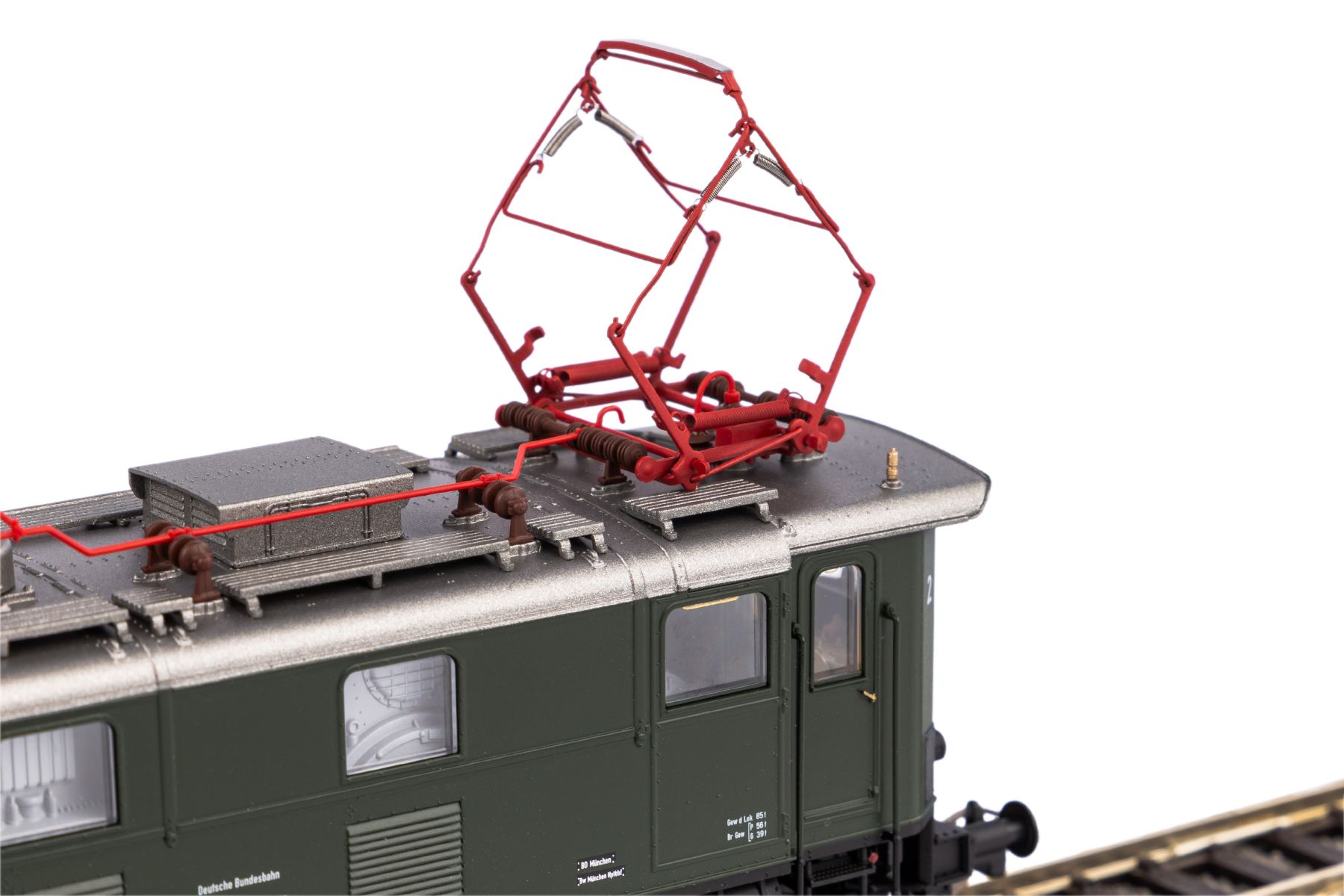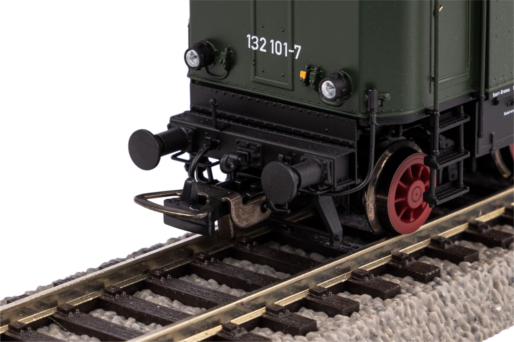 Variante der BR E 32 in der Ausführung als BR 132 in Epoche IV. Nach den Baureihen E 52 (Art.-Nr. 51824) und E 91 (Art.-Nr. 51540) bringt PIKO nun mit der E 32 einen weiteren wichtigen Vertreter der Altbau-Elektroloks. Der Stangenantrieb und die Speichenräder, die kurze Bauform sowie die Achsanordnung 1’C1‘, lassen die Verwandtschaft der Altbau-Elloks zu den Dampfloks durchscheinen. Nun hat PIKO dieses Stück Eisenbahngesichte en miniature umgesetzt. Besonderheiten sind die fein zu erkennenden Detaillierungen, wie die Nietung am Dach, angesetzte Teile, wie Sandkästen, Bremsschläuche und Handstangen. Zeitgenössische Lampen sowie die filigranen Scherenstromabnehmer runden das Modell optisch ab. Technisch weiß die Lok mit einem serienmäßig eingebauten Lichtwechsel in LED-Technik mit roter Schlussbeleuchtung zu begeistern. Für den Digitalbetrieb ist die E 32 von PIKO bestens durch eine PluX22-Schnittstelle nach NEM 658 gerüstet.