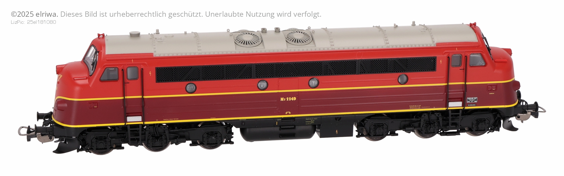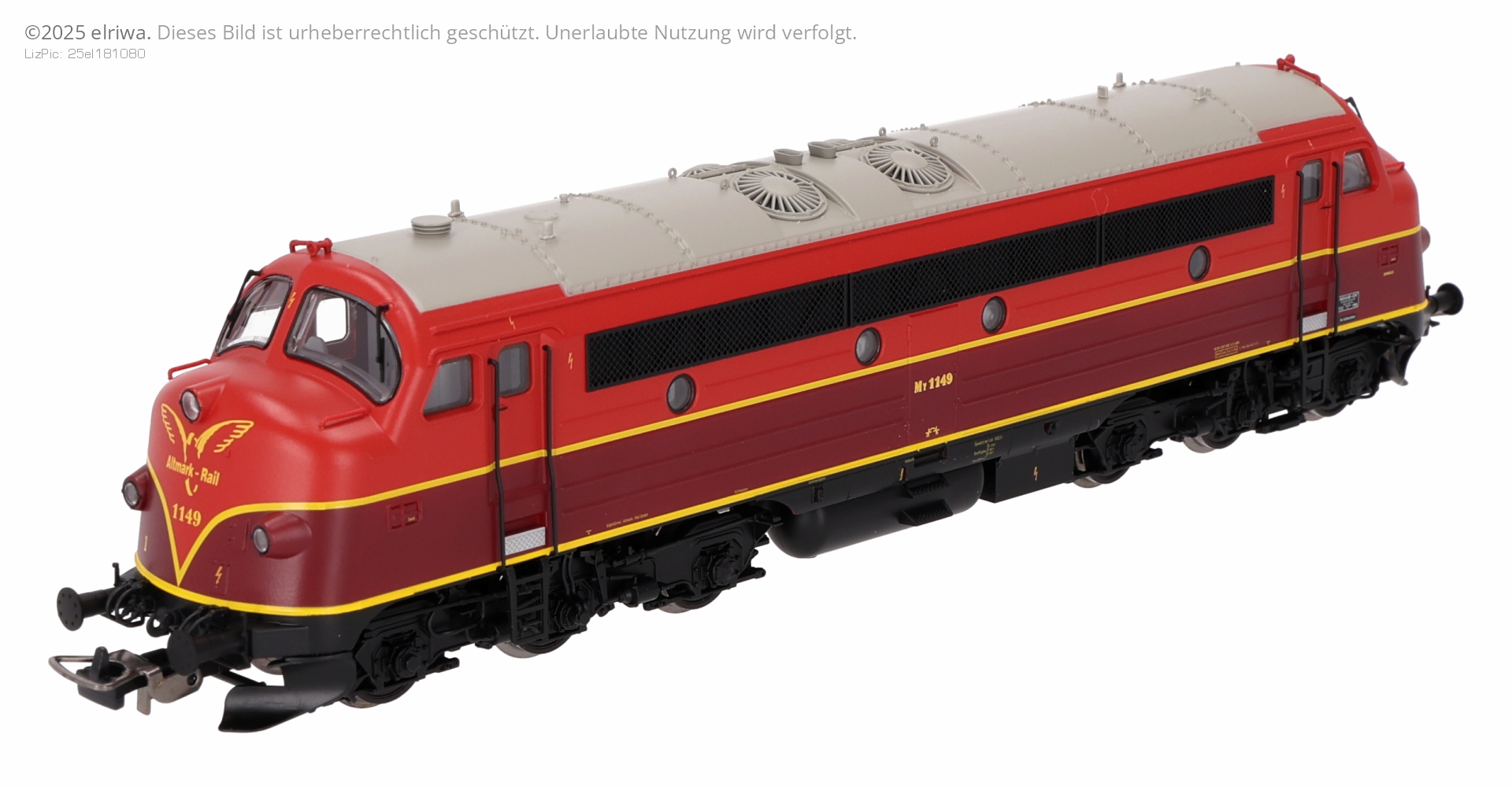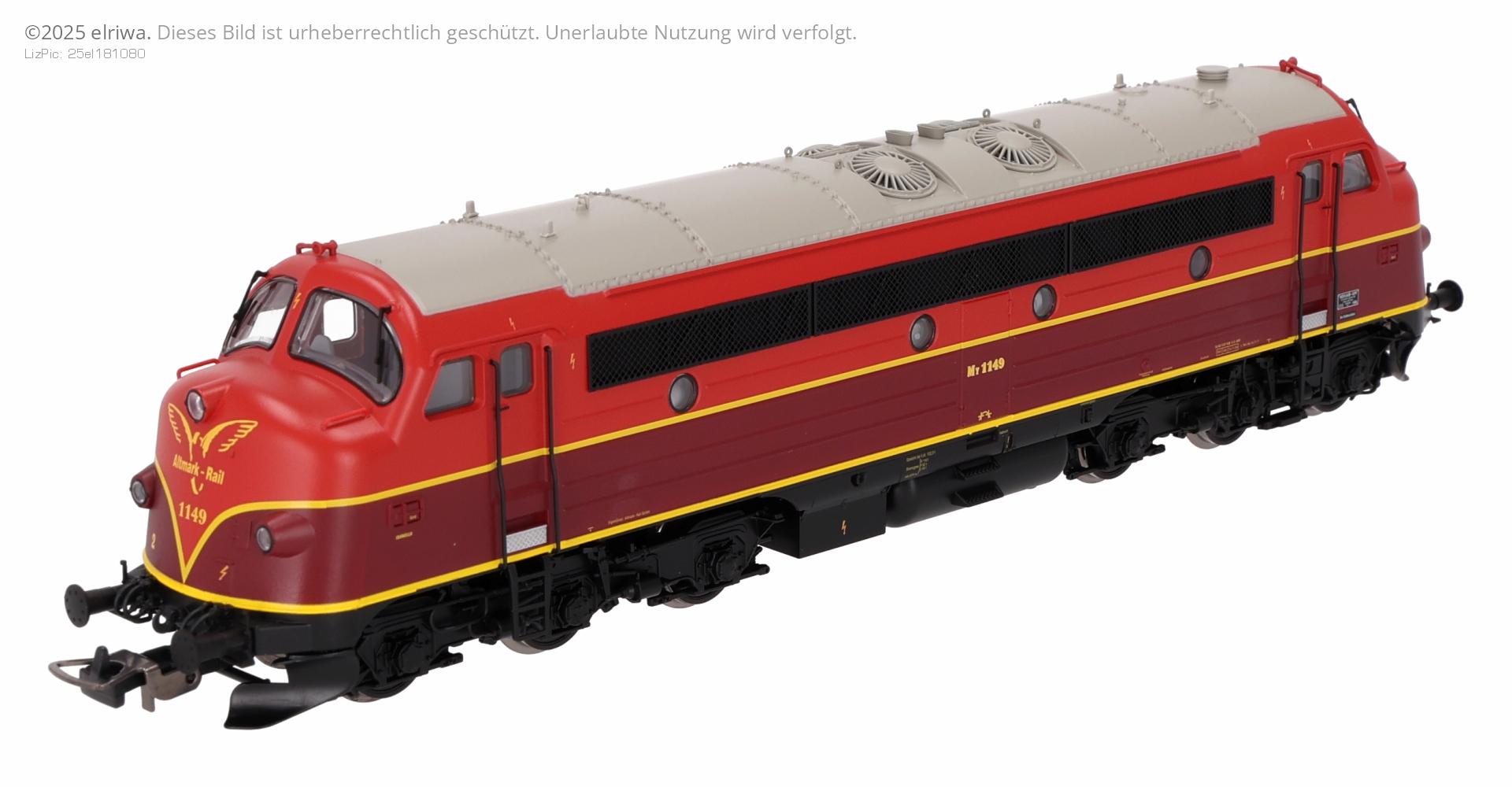 Die PIKO "Rundnase" in attraktiver Bedruckung der 1149 von Altmark-Rail in Epoche VI. Über Geschmack lässt sich trefflich streiten, es gibt jedoch Dinge, deren Eleganz über jeden Zweifel erhaben ist. Von der unbestrittenen Eleganz des Vorbilds dürfen auch die PIKO Modelle der NoHAB profitieren. Um diesen Gesamteindruck zu erreichen wurde großer Wert auf Details gelegt. Die seitlichen Lüftungsgitter werden als stark gliedernde Elemente des Lokkastens mit feinen Ätzteilen ausgeführt und sind ein absoluter Blickfang. Aber auch die markanten stirnseitigen Scheiben sowie die seitlichen „Bullaugen“ tragen durch den perfekt bündigen Sitz zum hervorragenden Bild bei. Vollendet wird der Eindruck durch die präzise und hochdetaillierte Gestaltung der Drehgestelle. Als Antrieb dient ein kräftiger und laufruhiger Motor mit zwei Schwungmassen. Das werkseitig mit einem PSD XP Sound-Decoder ausgestattete Modell überzeugt durch zahlreiche Digitalfunktionen und kernigen Klang auf der Anlage.