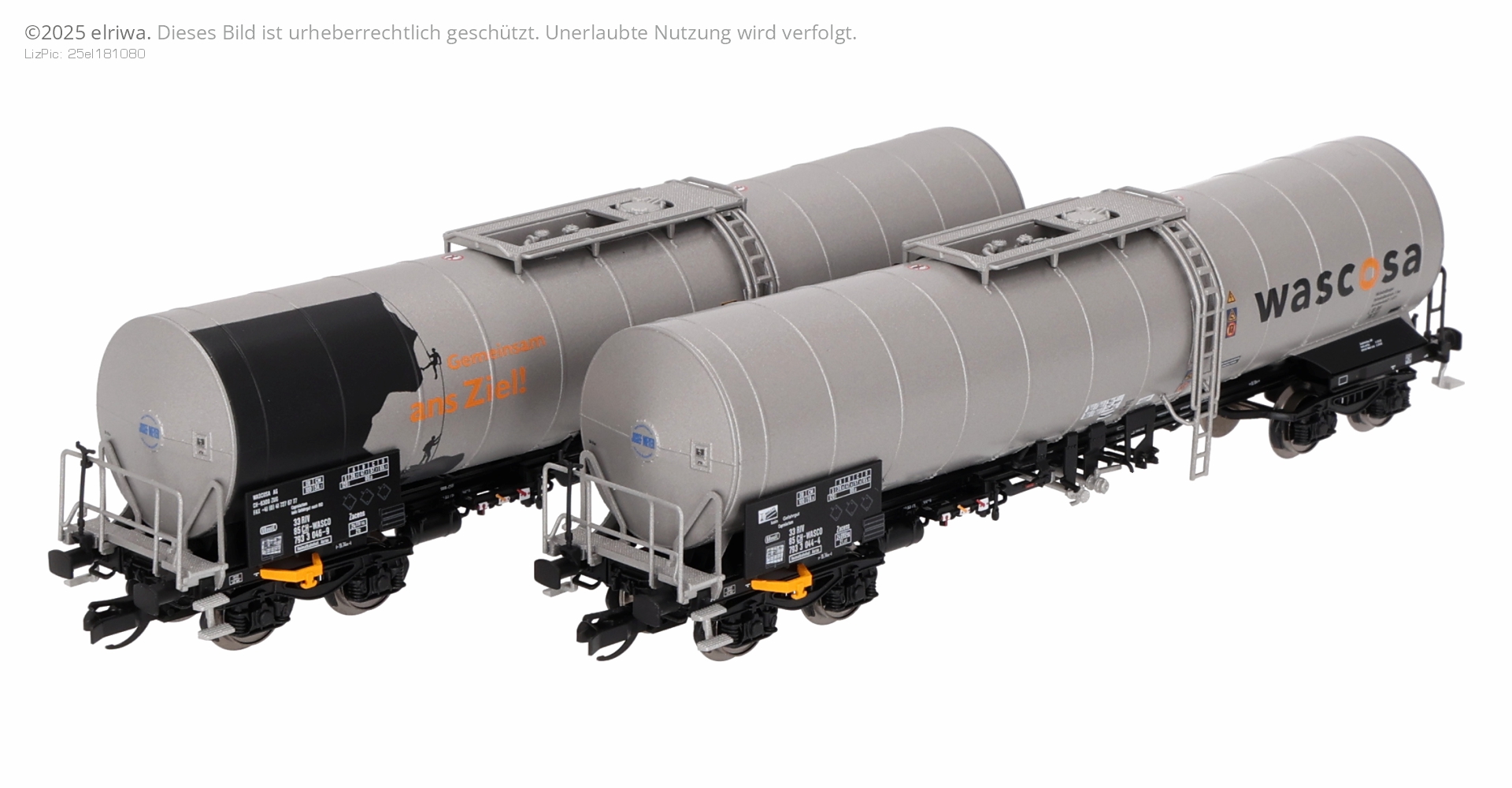 Da wir bereits zahlreiche Kesselwagen exklusiv herausgebracht haben, wissen wir, dass "Wascosa" äußerst beliebt ist und oft zu den erfolgreichsten Varianten zählt. Daher fiel die Wahl auf ein 2er-Set der Chemiekesselwagen der Bahngesellschaft Wascosa. Besonders hervorzuheben ist ein Wagen mit einem auffälligen Bergsteigermotiv.