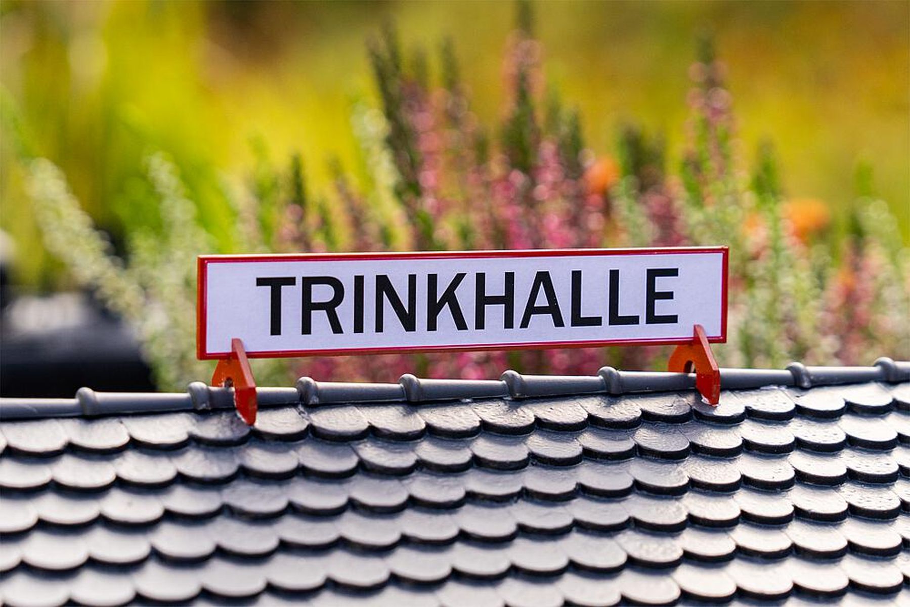 Geselliger Treffpunkt für eine kleine Pause! Das Modell überzeugt durch seine Gestaltung mit heller Holzverkleidung, einem klassischen Satteldach mit dunklen Dachziegeln und einer markanten rot-weißen Markise über den großen Verkaufsfenstern. Durch die offene Theke blickt man direkt auf Flaschen, Gläser und kleine Snacks. Vor dem Kiosk sorgt der eingezäunte Biergarten mit weißen Gartenstühlen, Tischen und blau-weißem Sonnenschirm für gemütliche Atmosphäre. Liebevolle Details wie Getränkekisten, ein Zigarettenautomat und nostalgische Reklameschilder runden die Szene stimmungsvoll ab!