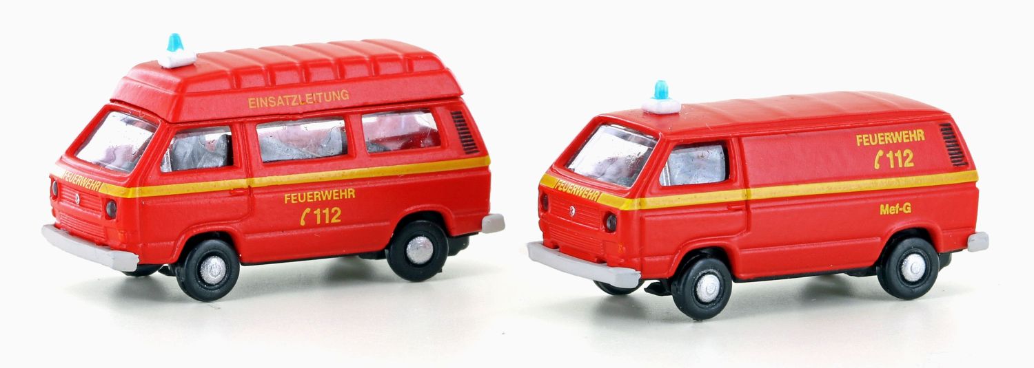 Der VW Golf III fährt erstmals als Einsatzleitfahrzeug der Feuerwehr ins Programm der Spur N. Dazu rüsten die Traditionsmodellbauer den Youngtimer mit einer Signaleinrichtung auf dem Dach aus. Karosserie rot, Fahrgestell schwarzgrau, weißer Warnlichtbalken mit blautransparenten Warnleuchten. Auf den Karosserieseiten Schriftzug Feuerwehr in weiß. VW-Logo vorn gesilbert, Scheinwerfer ebenfalls.