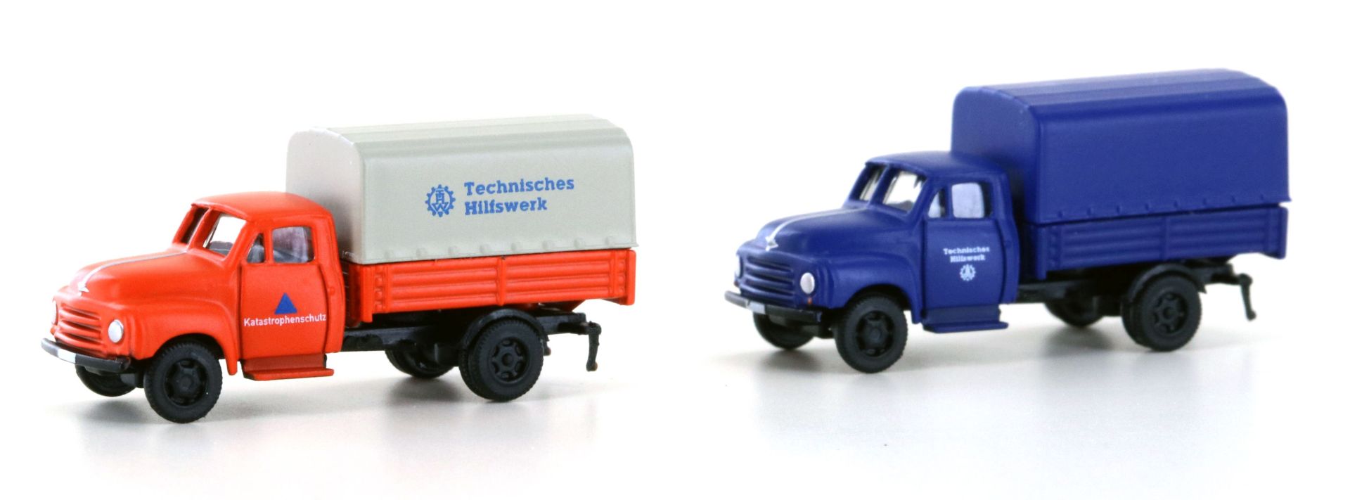 MiNis LC3235 - 2er Set Opel Blitz Pritsche/Plane THW+Katastrophenschutz