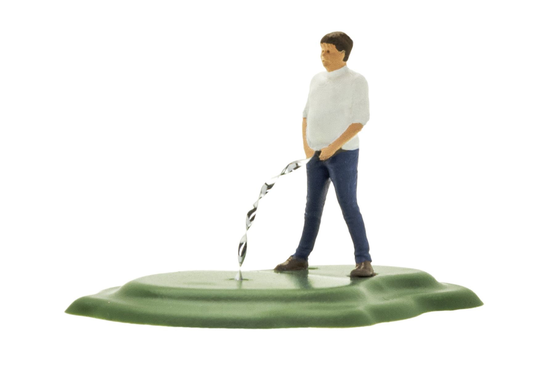 Wer steht denn da hinter dem Busch? Erwischt! Eine Figur aus der Reihe Bewegte Welt mit realistischen Bedürfnissen. Ein fließender Wasserstrahl wird durch ein sich drehendes Acrylglas-Element simuliert. Mit Unterflurantrieb. Einbautiefe: 45 mm.