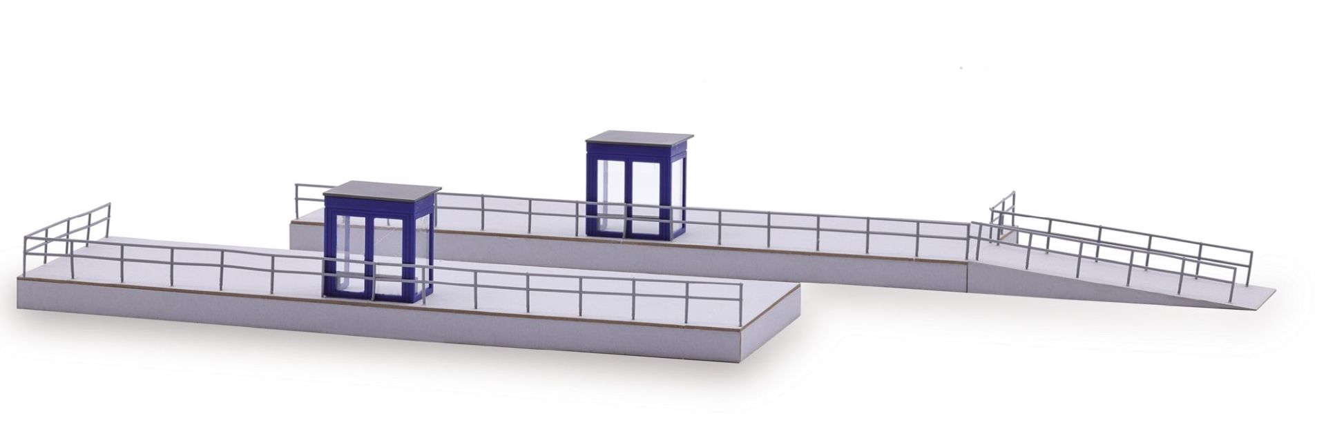 Bausatz für einen Bahnsteig inklusive Güterrampe und zwei Wartehäuschen. Passend für alle Bahnhöfe. Gesamtmaße: 495 x 64 mm, 20 mm. Größe Wartehäuschen: 21 x 16 mm, 27 mm.